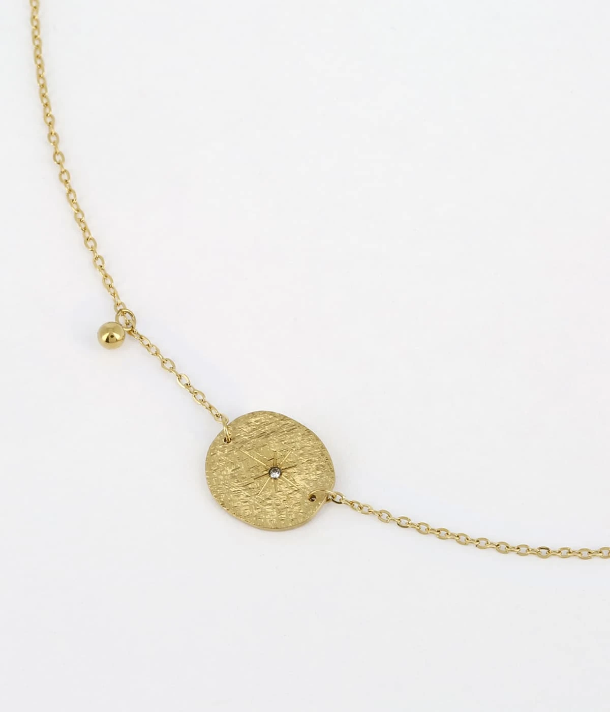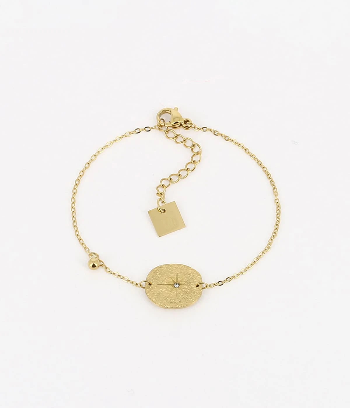 Bracelet en acier uni ou doré à l’or fin, sur lequel sont accrochées une pampille et une petite plaque en métal brossé serti en son centre d’un zirconium.