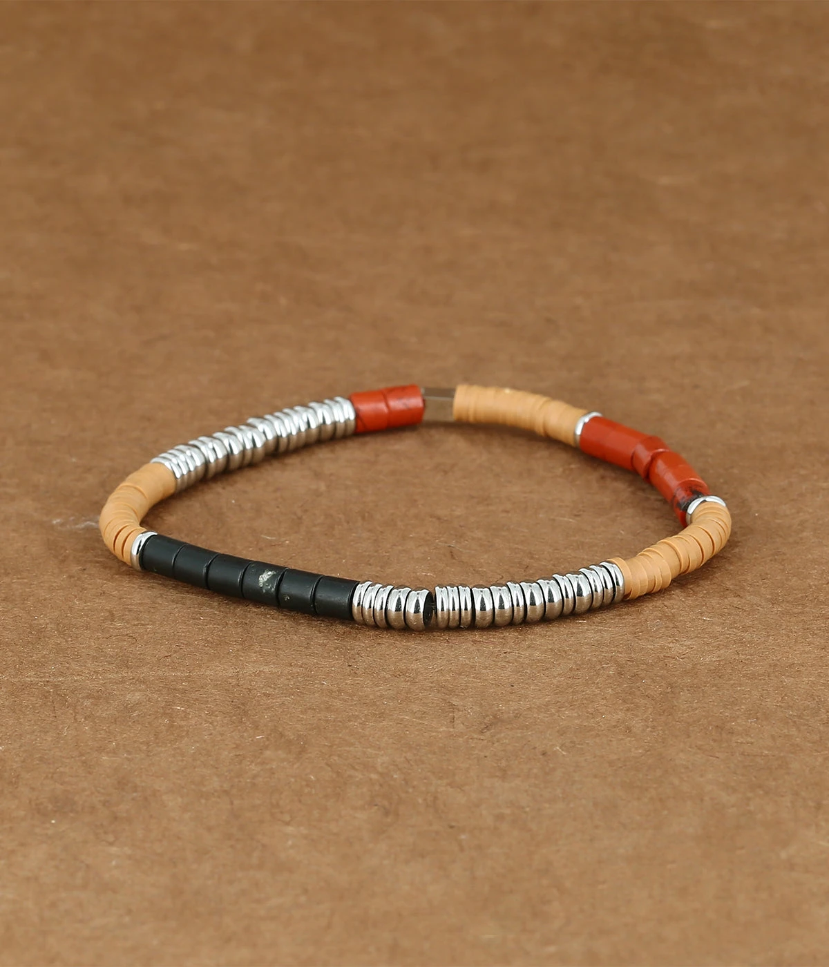 Bracelet élastique sur lequel sont enfilées des rondelles colorées et en acier.