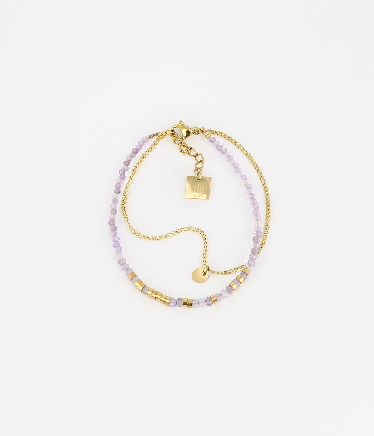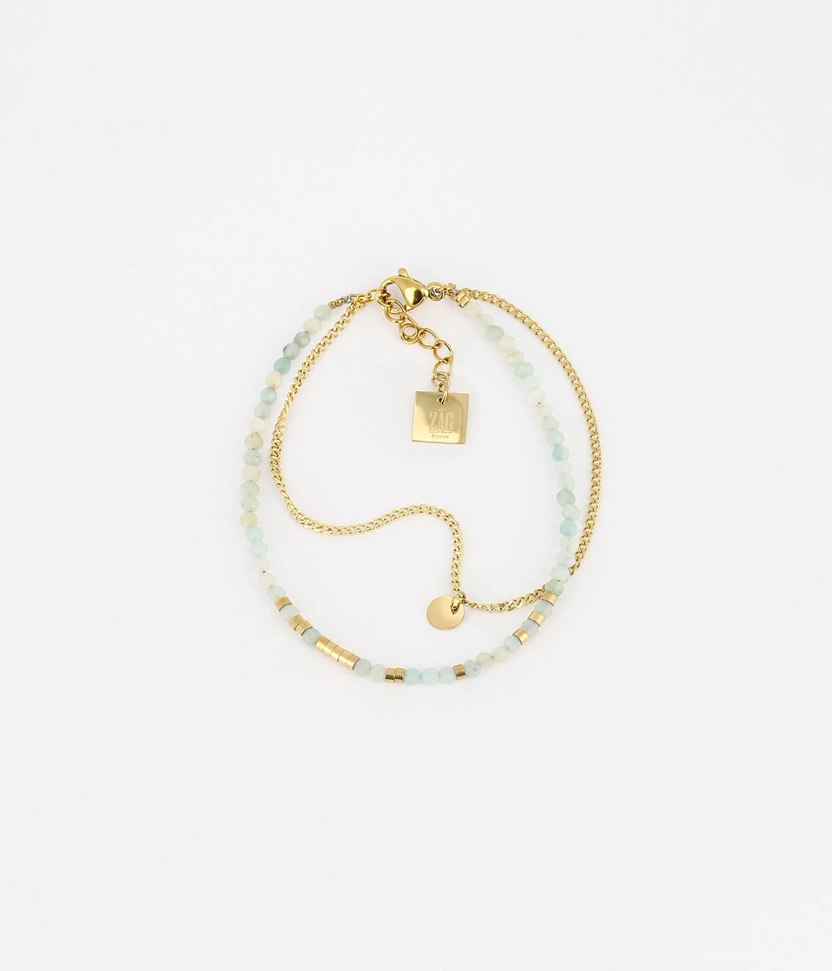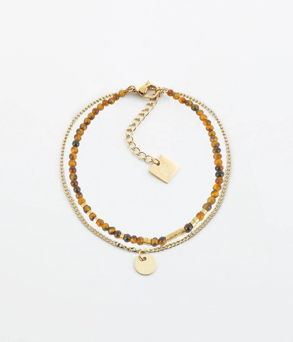 Bracelet double rang en acier doré à l’or fin. Le premier rang est un enfilage de pierres naturelles mélangé à des ajouts de métal, et le deuxième est une petite chaîne gourmette classique.