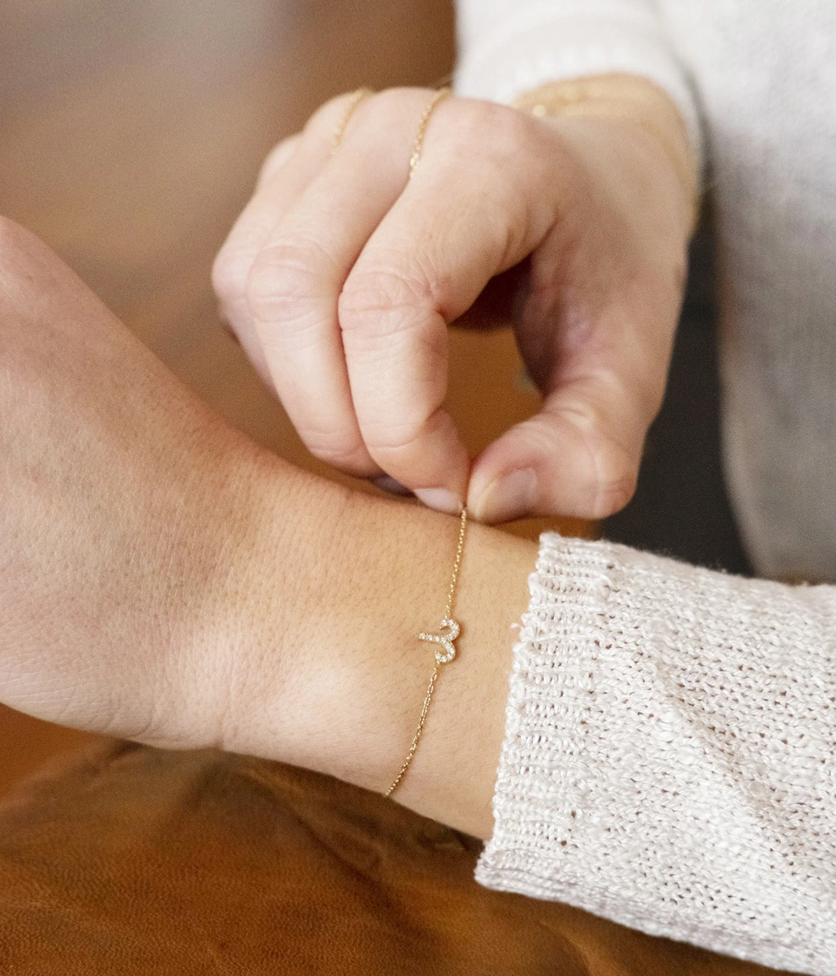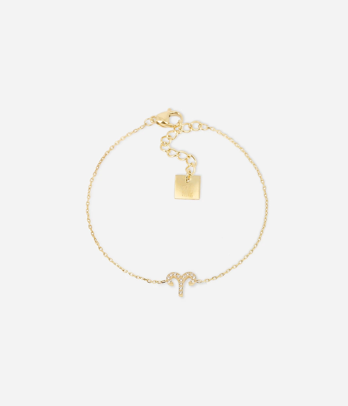 Bracelet en acier doré à l’or fin sur lequel est attaché un motif représentant le signe du zodiaque Bélier, serti de zirconiums.