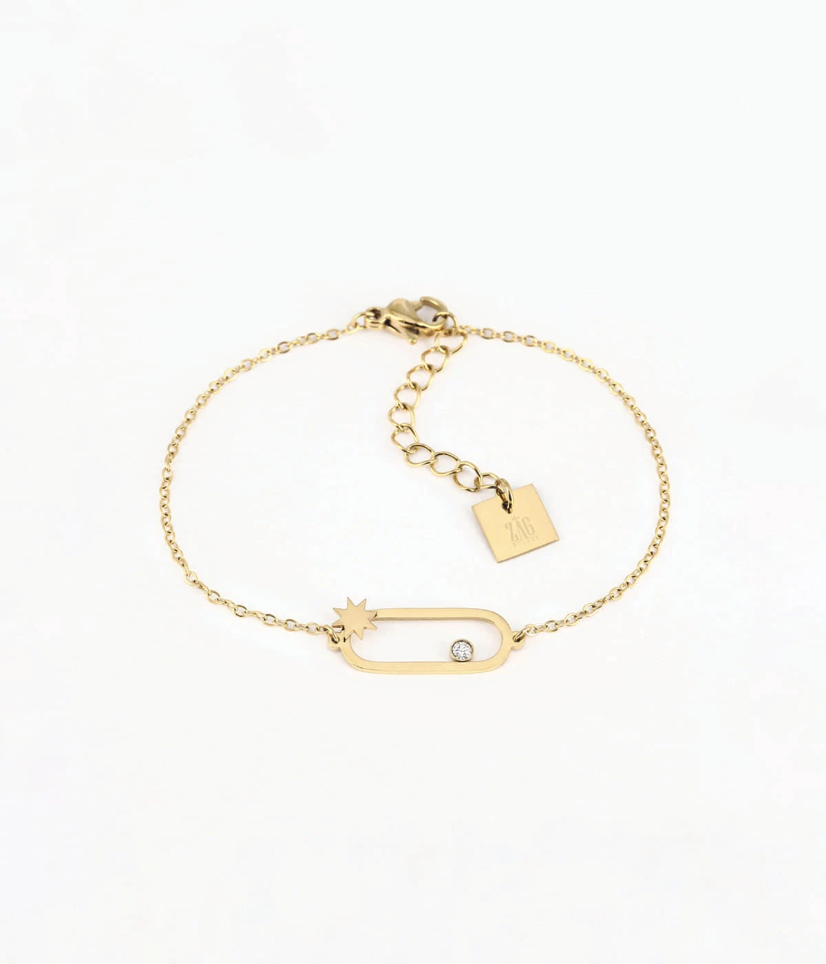 Bracelet en acier uni ou doré à l’or fin. Un ovale de métal laqué d’un cristal en serti clos est placé entre les deux chaînes.