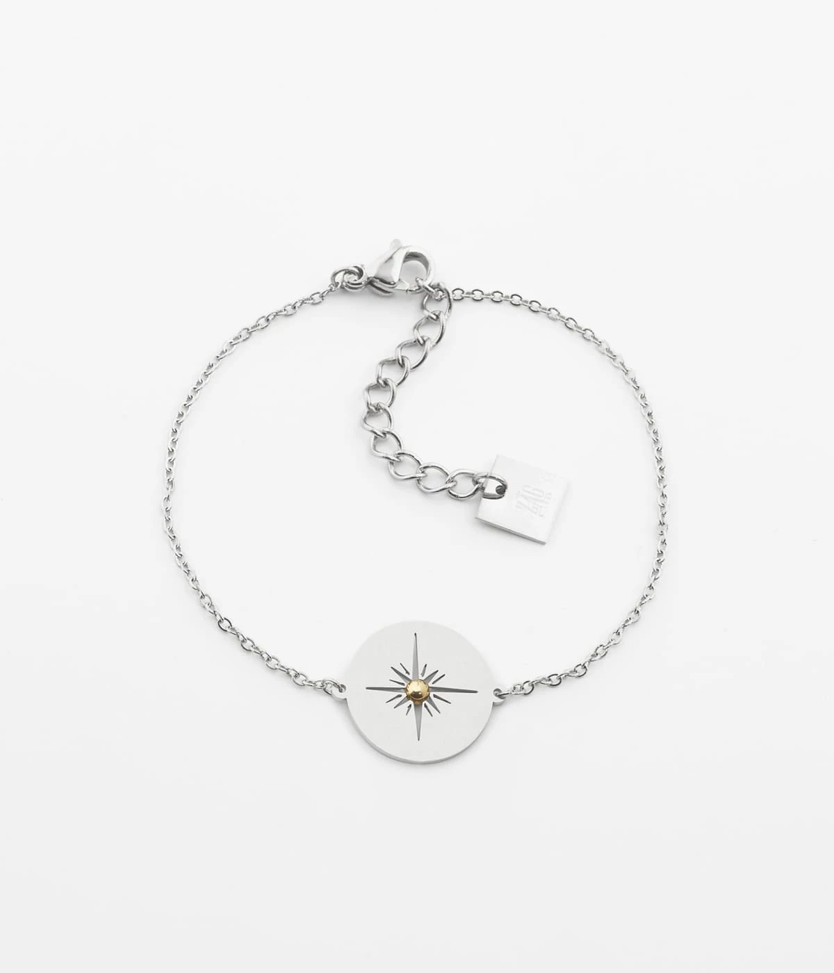 Bracelet chaînette en acier uni ou doré à l’or fin. Une médaille centrale est finement gravée d’un motif représentant les quatre points cardinaux.