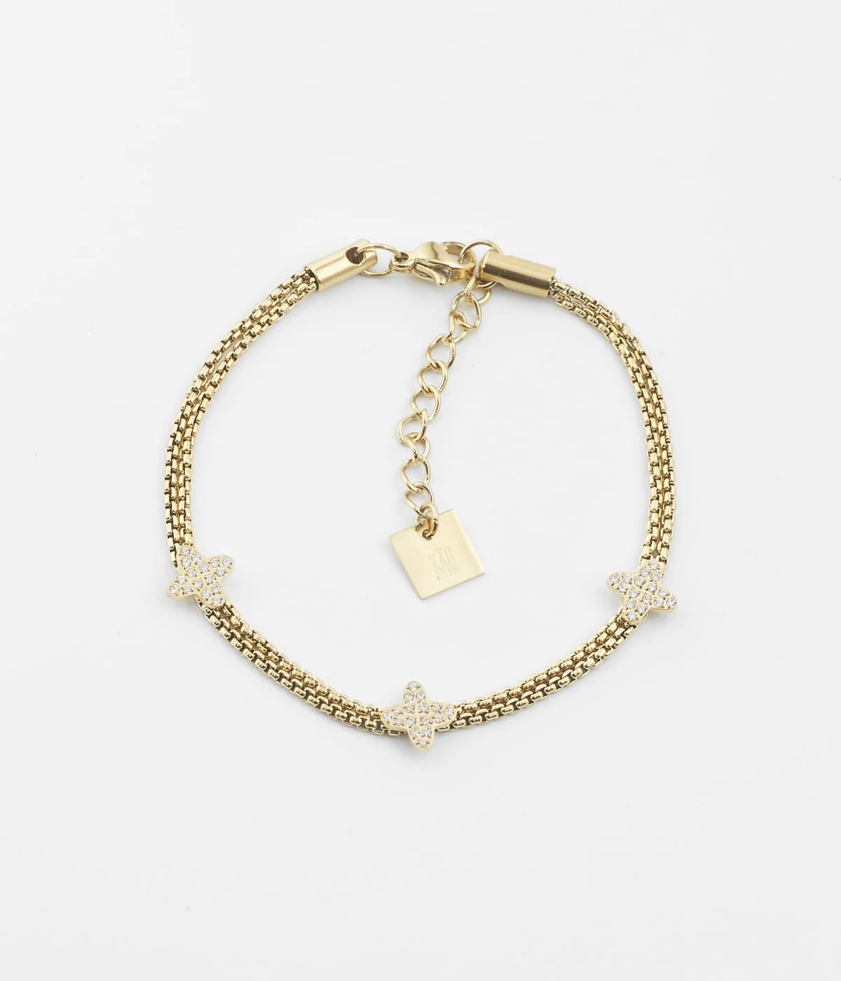 Bracelet chaîne grains de riz, en acier uni ou doré à l’or fin, sur lequel sont piqués trois motifs de fleur sertis de zirconiums.