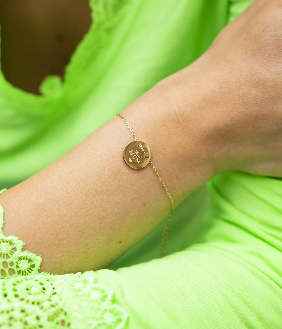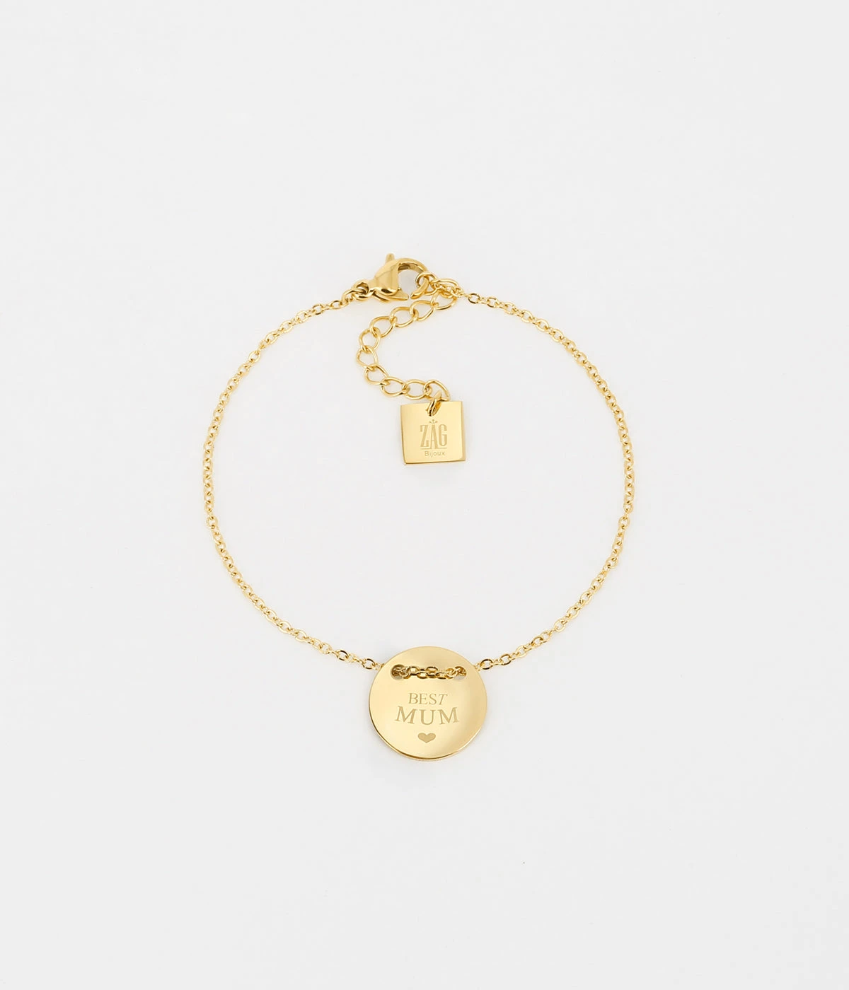 Bracelet chaîne en acier uni ou doré à l’or fin sur lequel une médaille gravée du mot « Best Mum » est attachée.