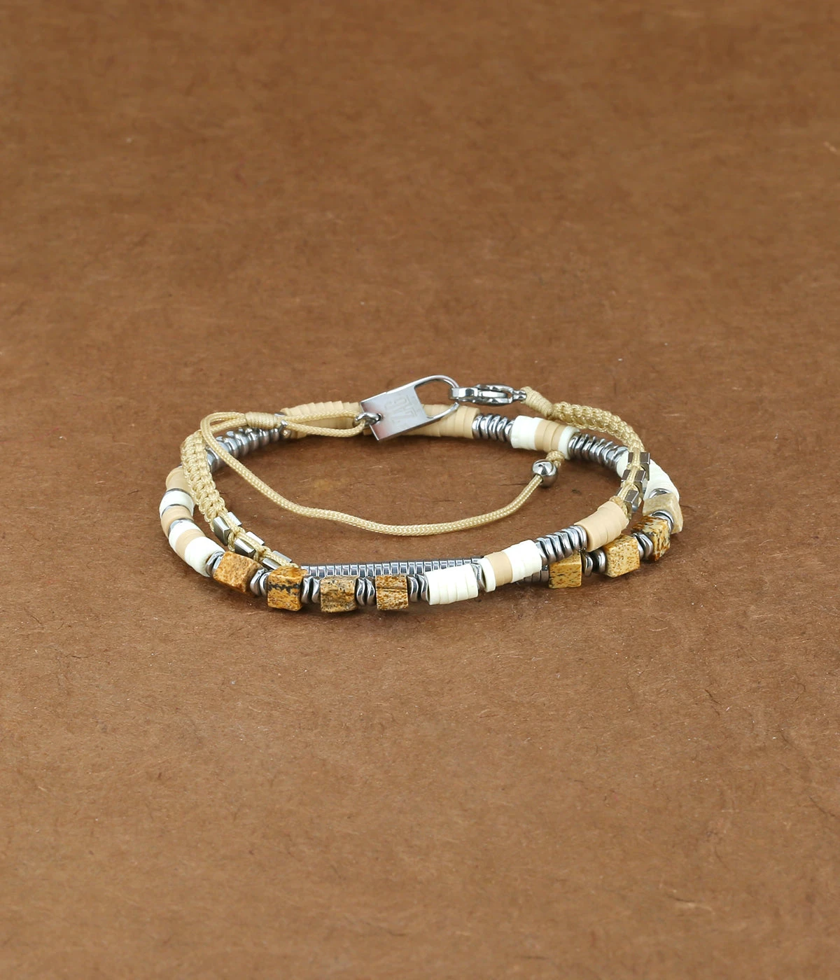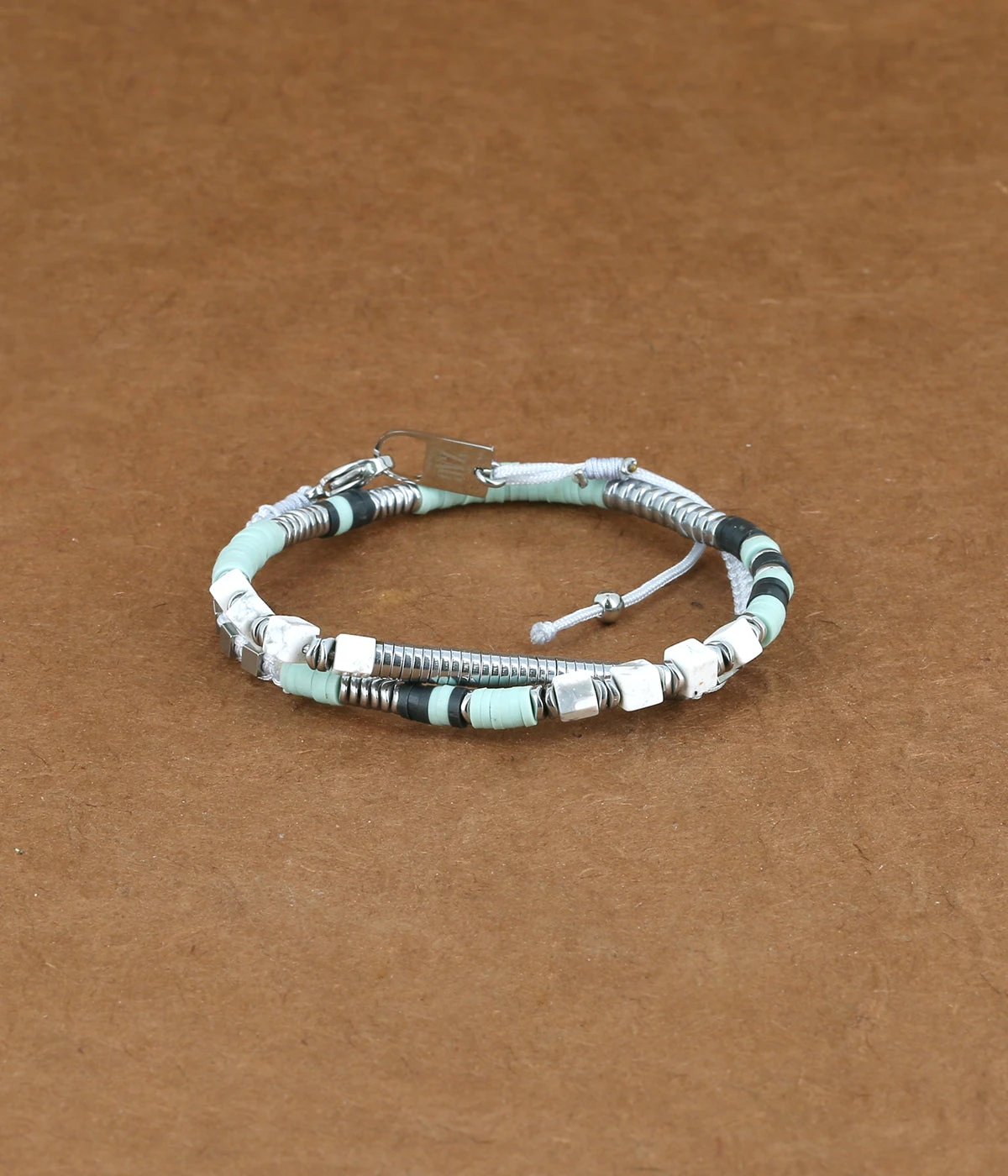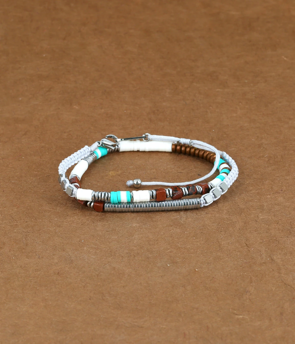 Dans un mélange de brun, de gris et d’acier uni, ce bracelet d’inspiration “surfeur” est un incontournable de notre collection.