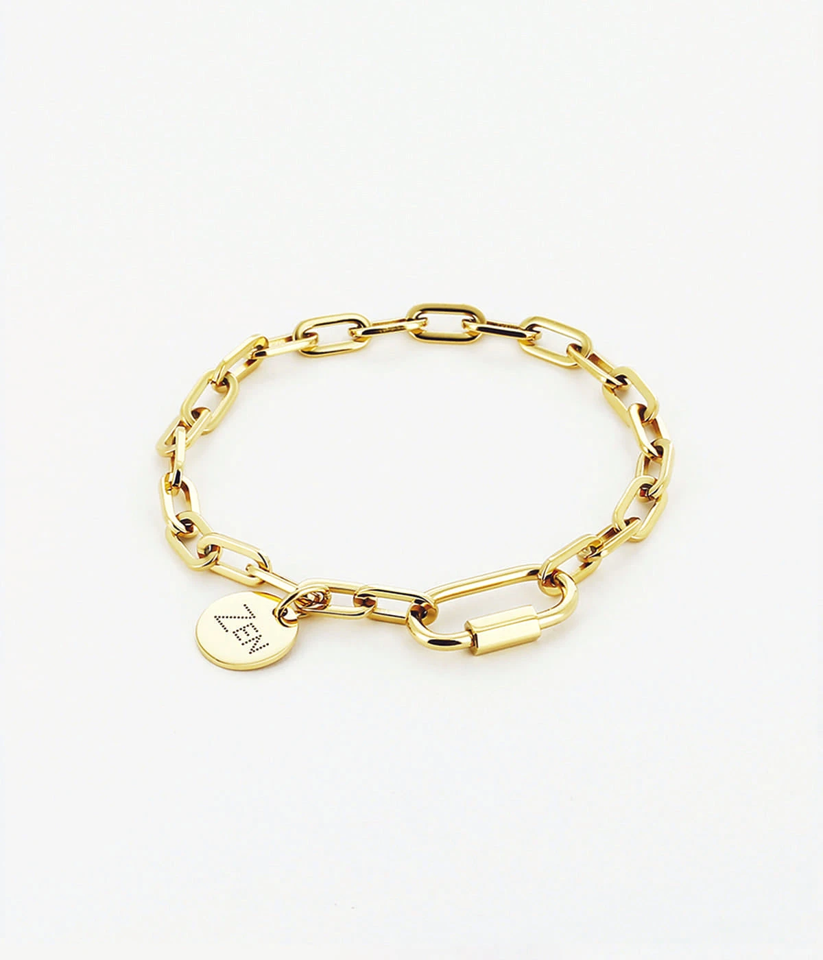 Bracelet chaîne à gros maillons en acier uni ou doré à l’or fin sur lequel est attachée une médaille gravée du mot « Zen ».