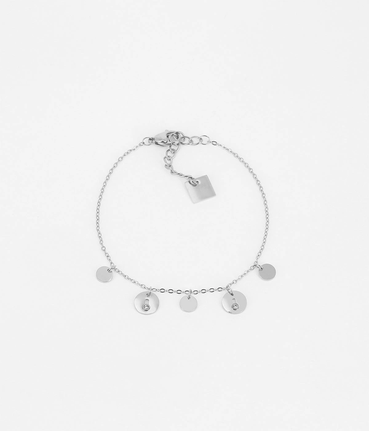 Bracelet en acier uni ou doré à l’or fin sur lequel sont attachées des pastilles, dont deux serties d’un zirconium.