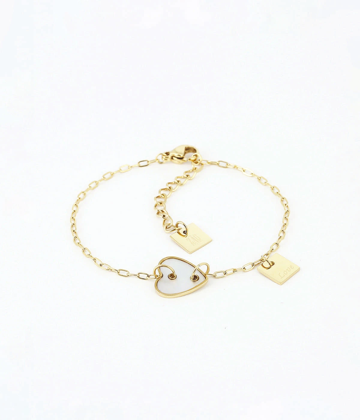 Bracelet chaîne ajustable en acier doré sur lequel est attaché un petit cœur serti de nacre.
