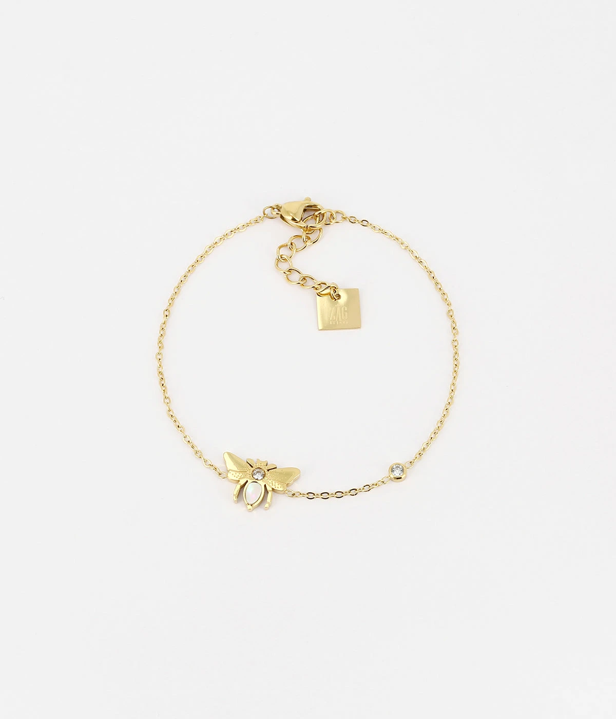 Bracelet en acier doré à l’or fin sur lequel est attaché un motif de papillon ciselé et orné de nacre et d’un zirconium.