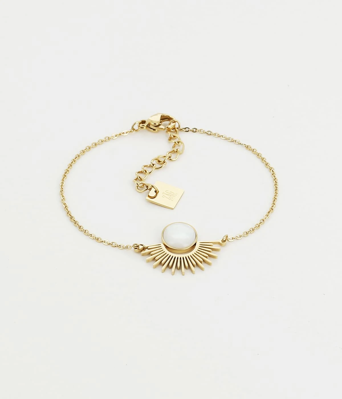 Bracelet chaînette en acier uni ou doré à l’or fin décoré d’un motif d’inspiration égyptienne serti d’une nacre blanche.