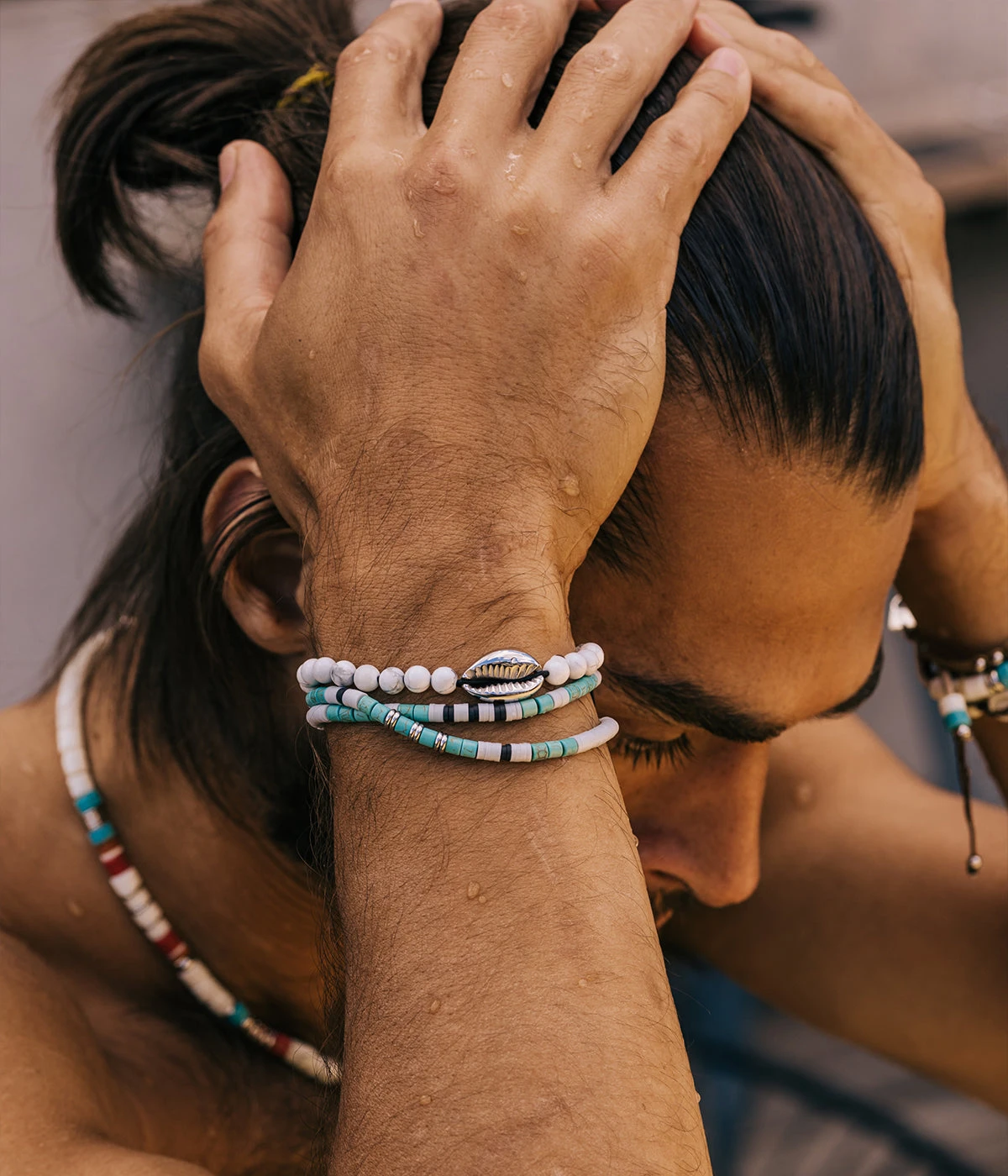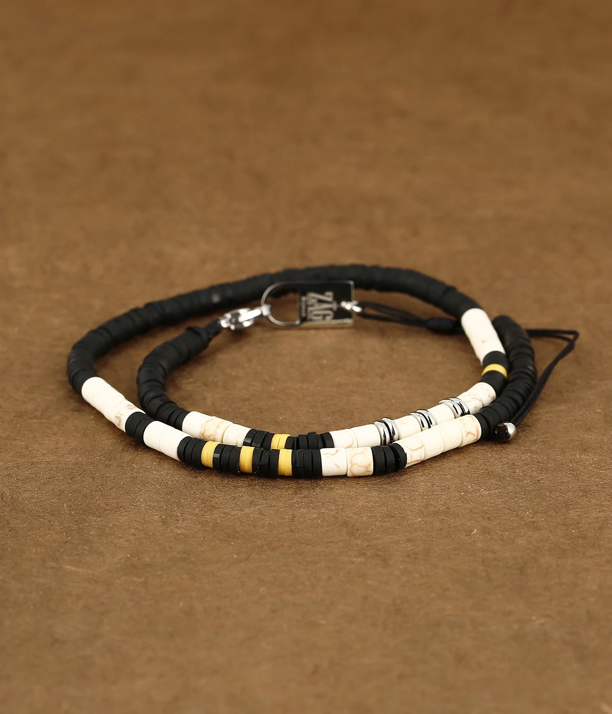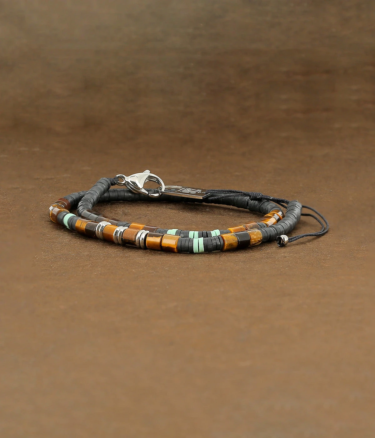 Dans un mélange de pierres de couleurs, ce bracelet très masculin est très lumineux sur le poignet.