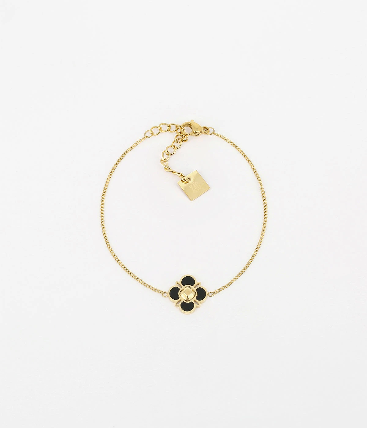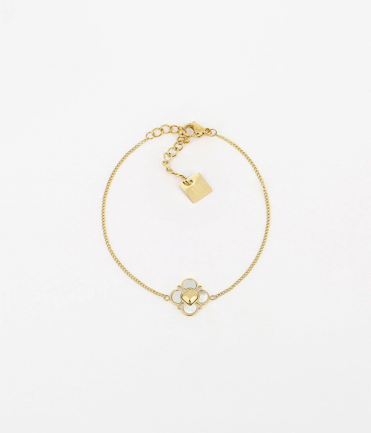 Bracelet en acier uni ou doré à l’or fin. Un petit trèfle à quatre feuilles est orné de pierres naturelles et d’un petit carré doré au centre.