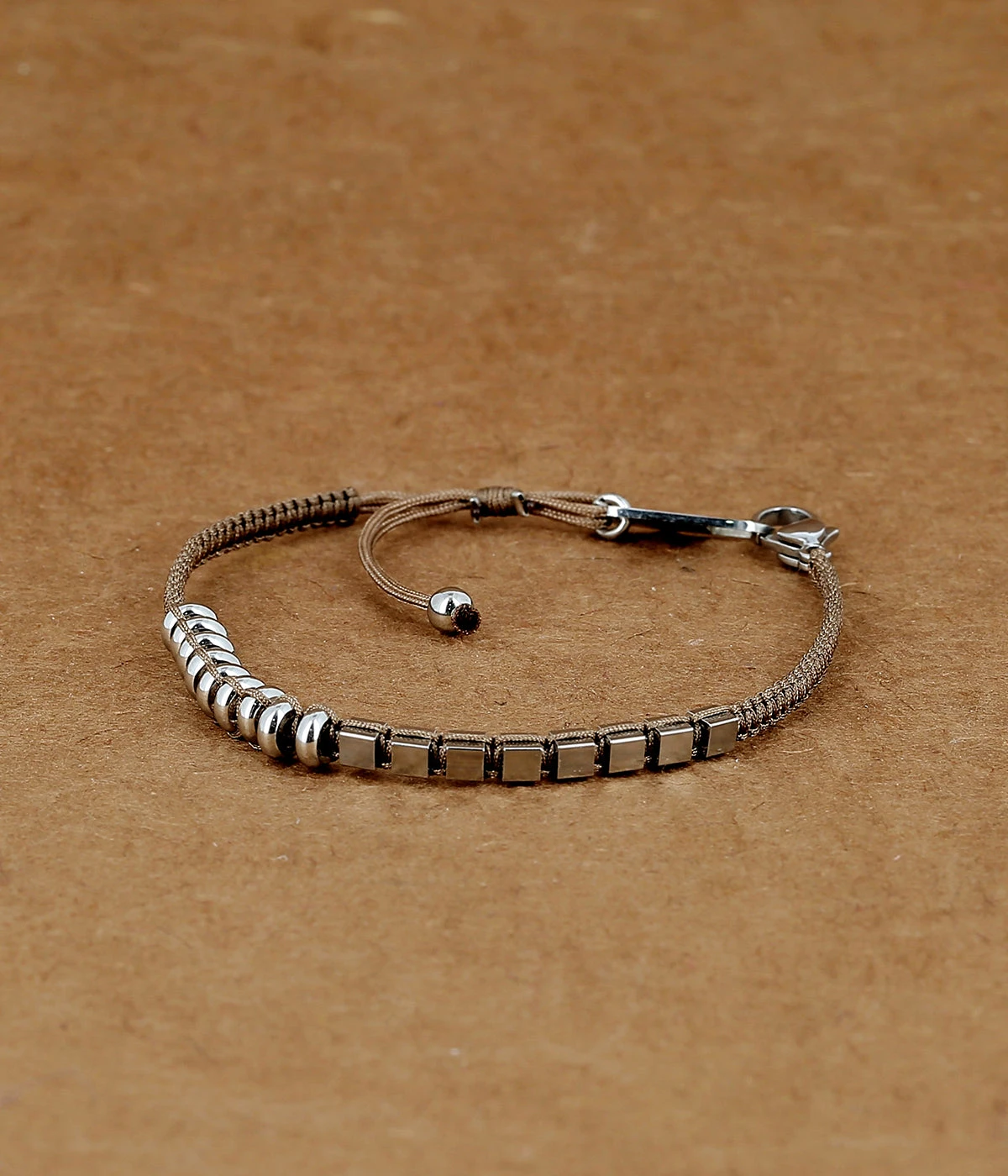 Bracelet ajustable sur lequel des formes géométriques en acier sont présentées.