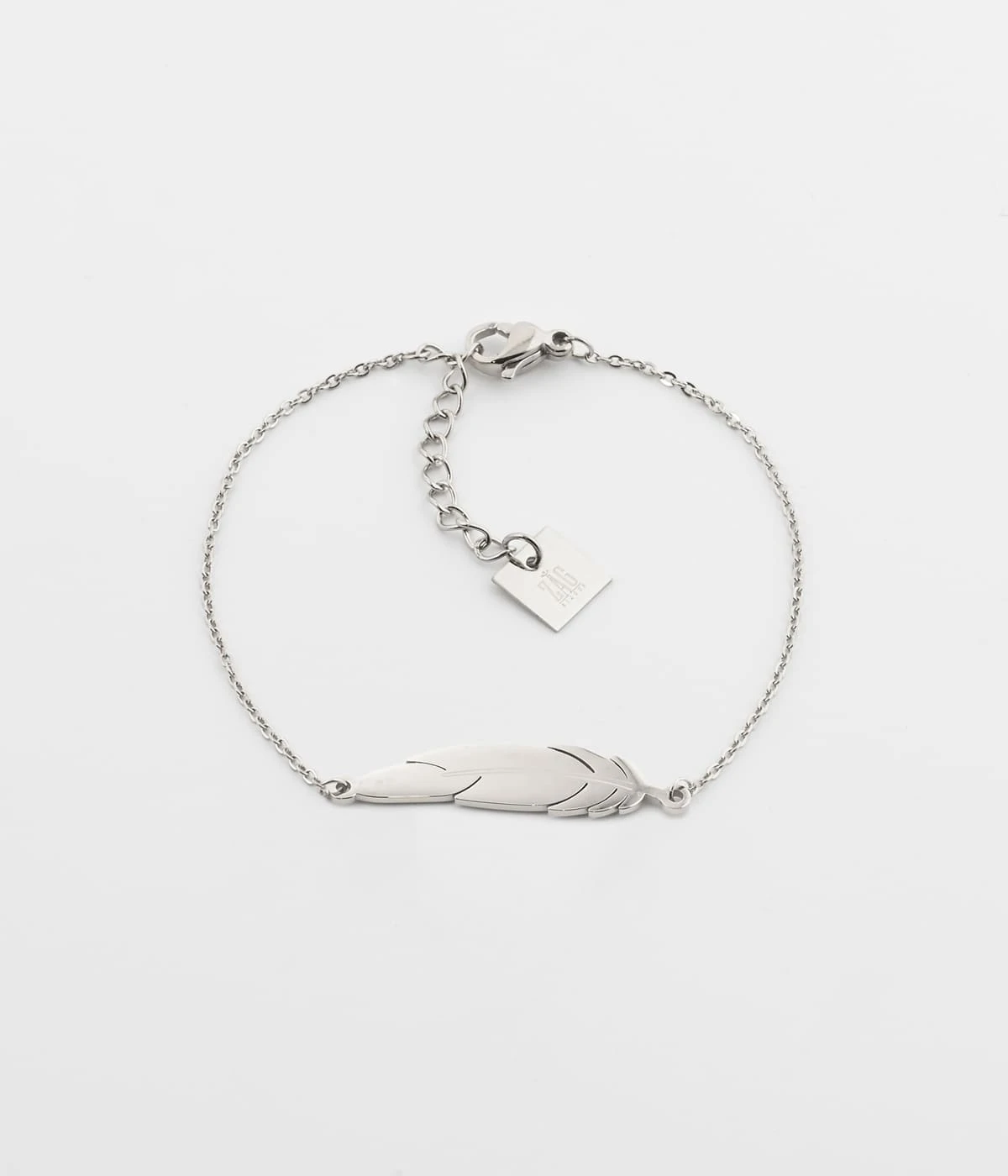 Bracelet chaîne en acier uni ou doré à l’or fin sur lequel est attaché un motif de plume ciselé.