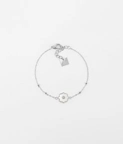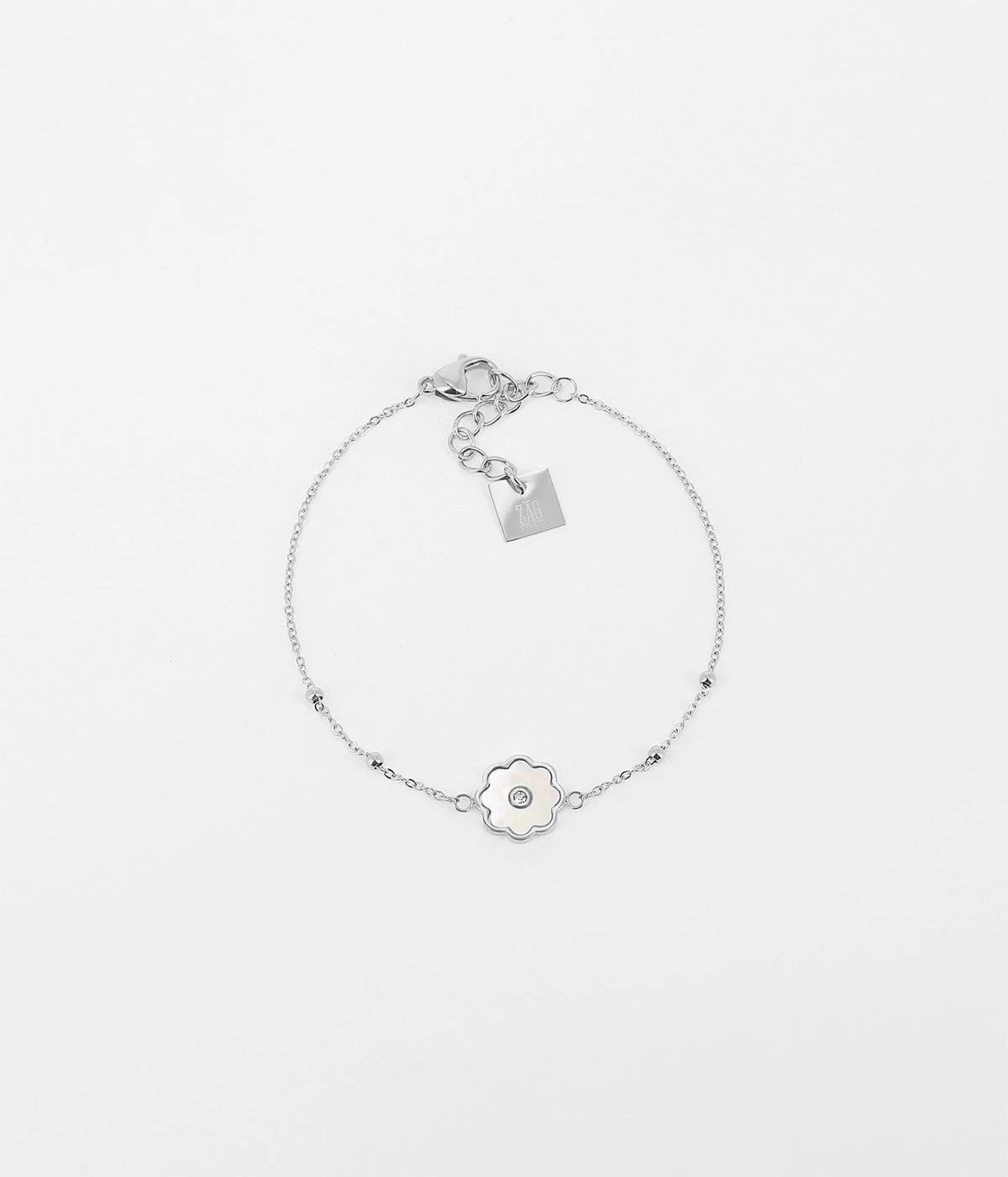 Bracelet en acier uni ou doré à l’or fin sur lequel un motif fleur coloré et serti d’un zirconium en son centre est attaché.