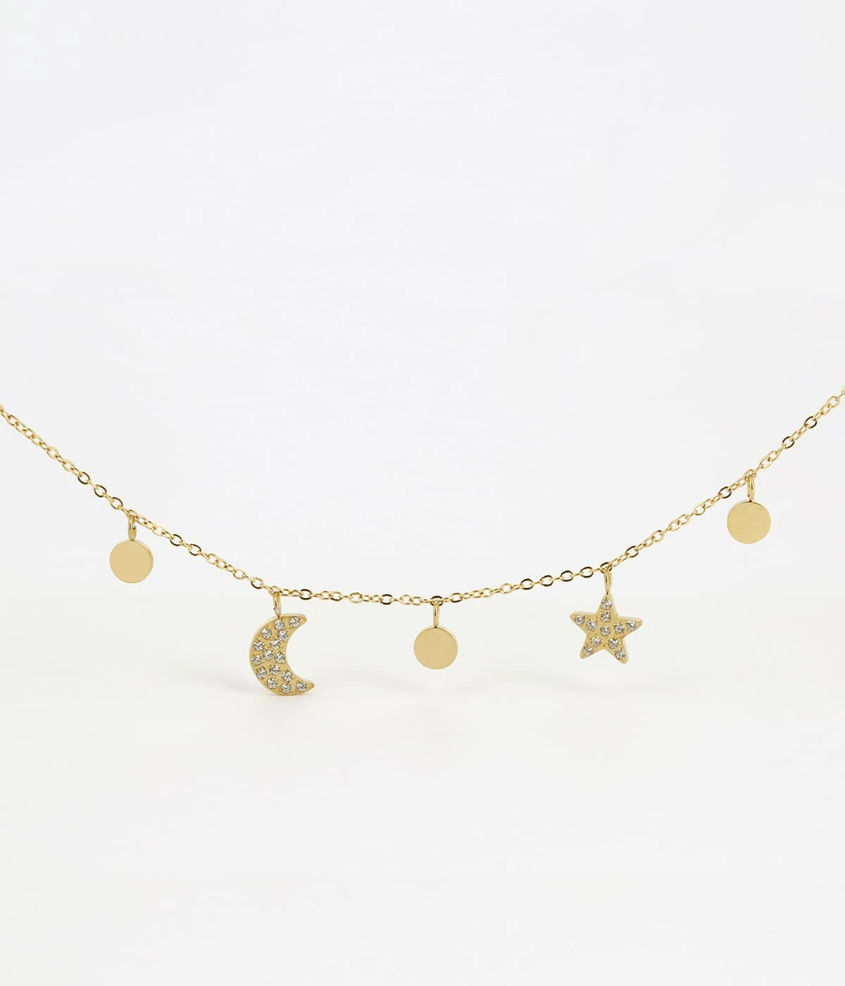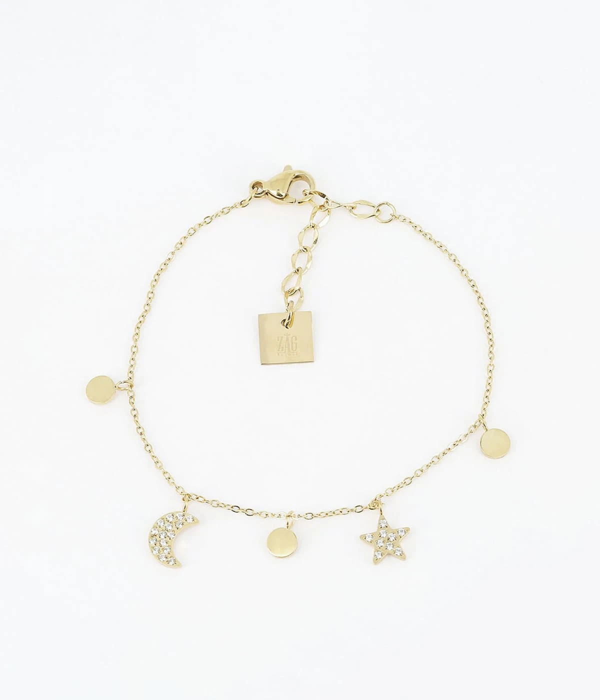 Bracelet chaîne en acier uni ou doré à l’or fin sur lequel des pampilles de métal et pavées de zirconiums sont attachées.
