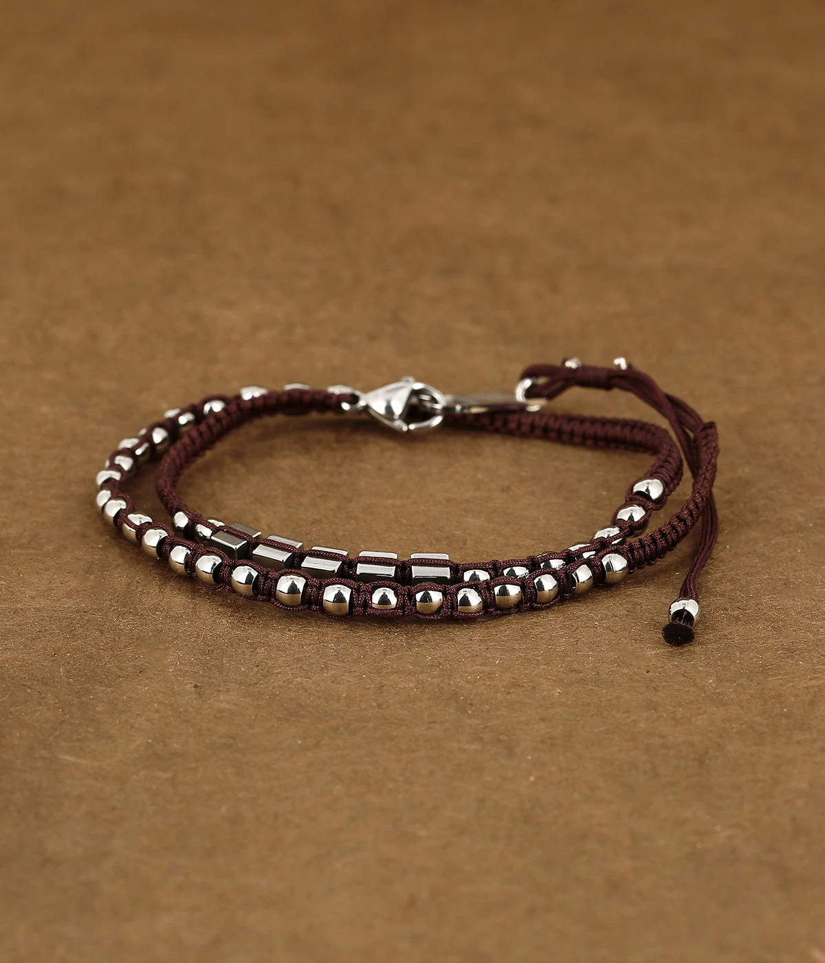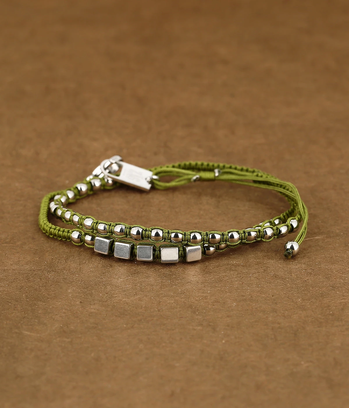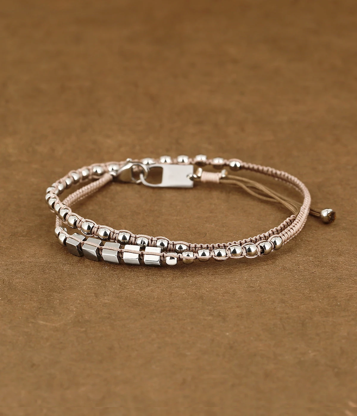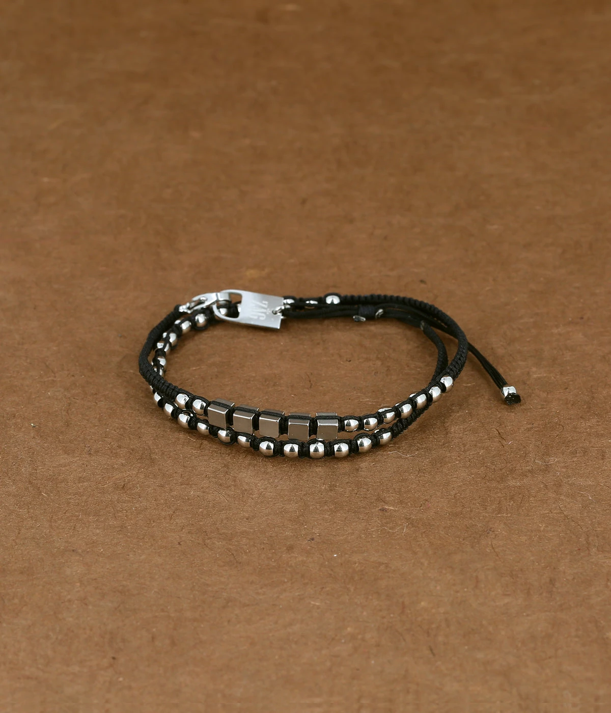 Bracelet cordon ajustable sur lequel sont enfilées des pièces de métal carrées et rondes.