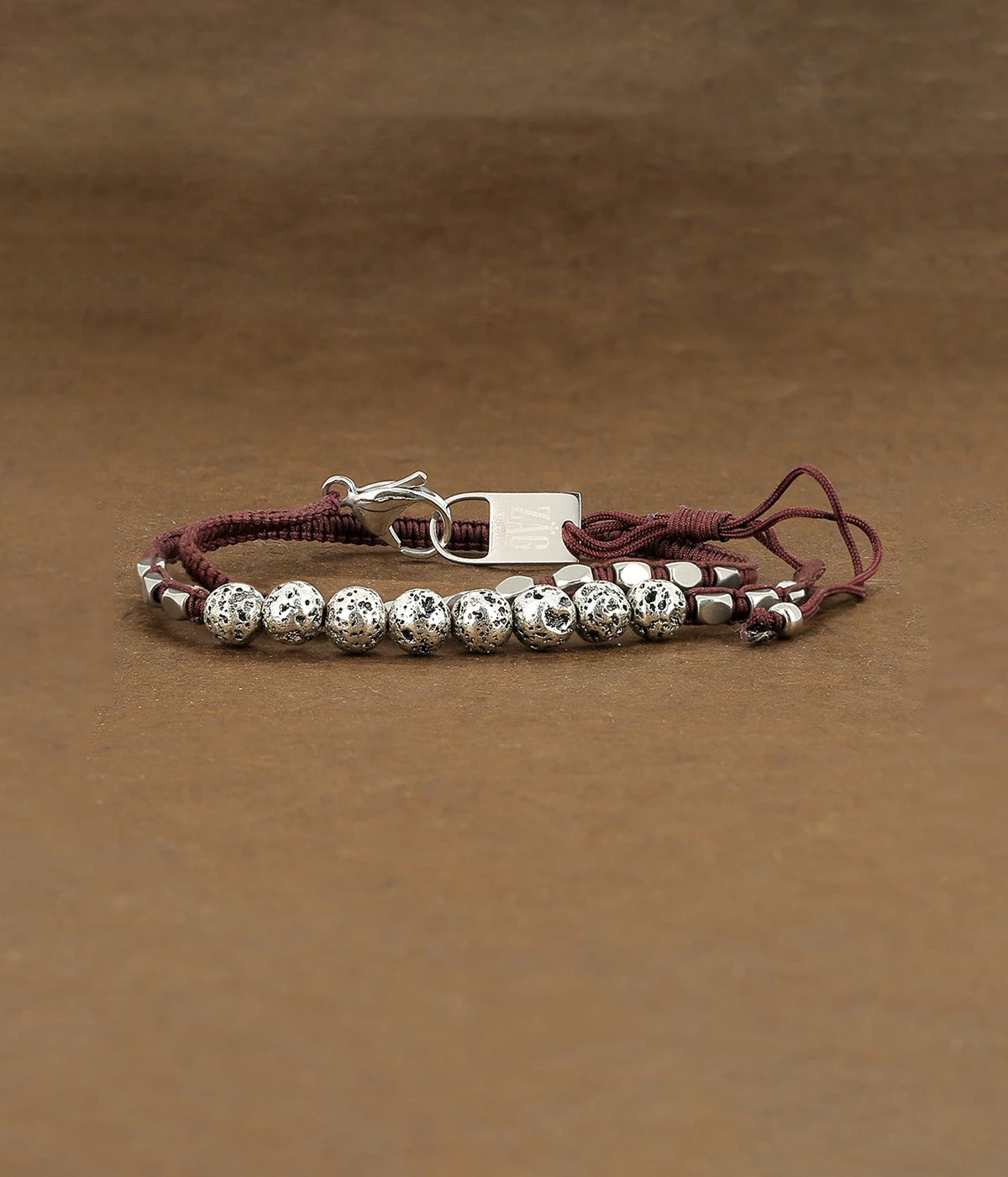 Bracelet cordon qui s’enlace deux fois autour du poignet. Des boules d’onyx noir ou de pierre de lave sont mélangées à des petites pièces de métal.