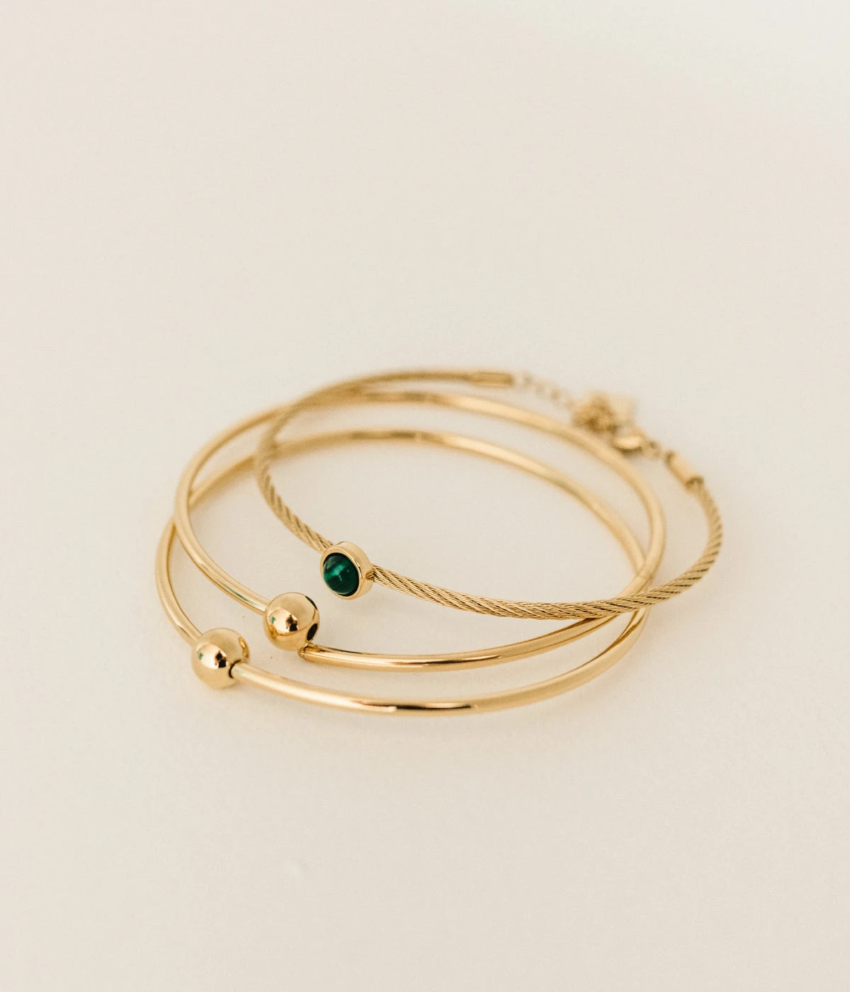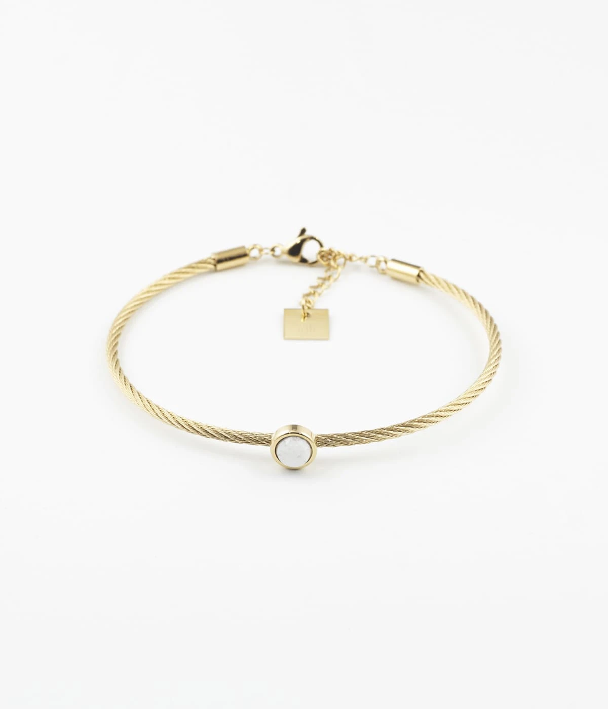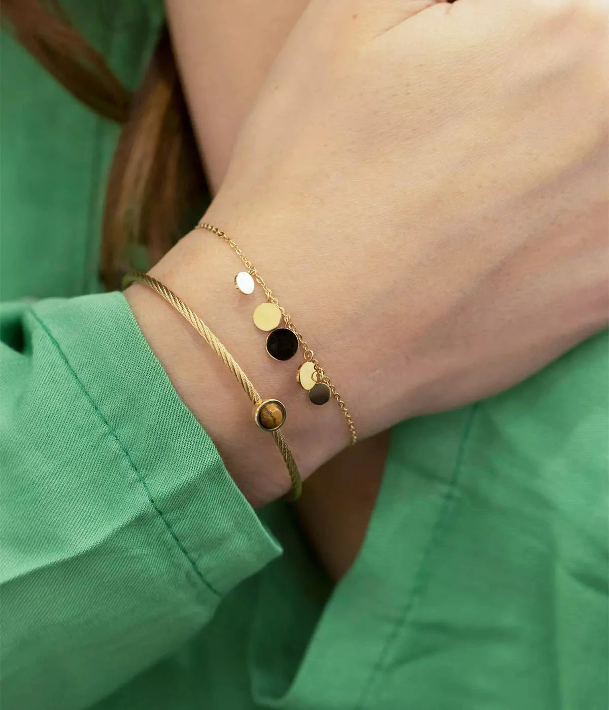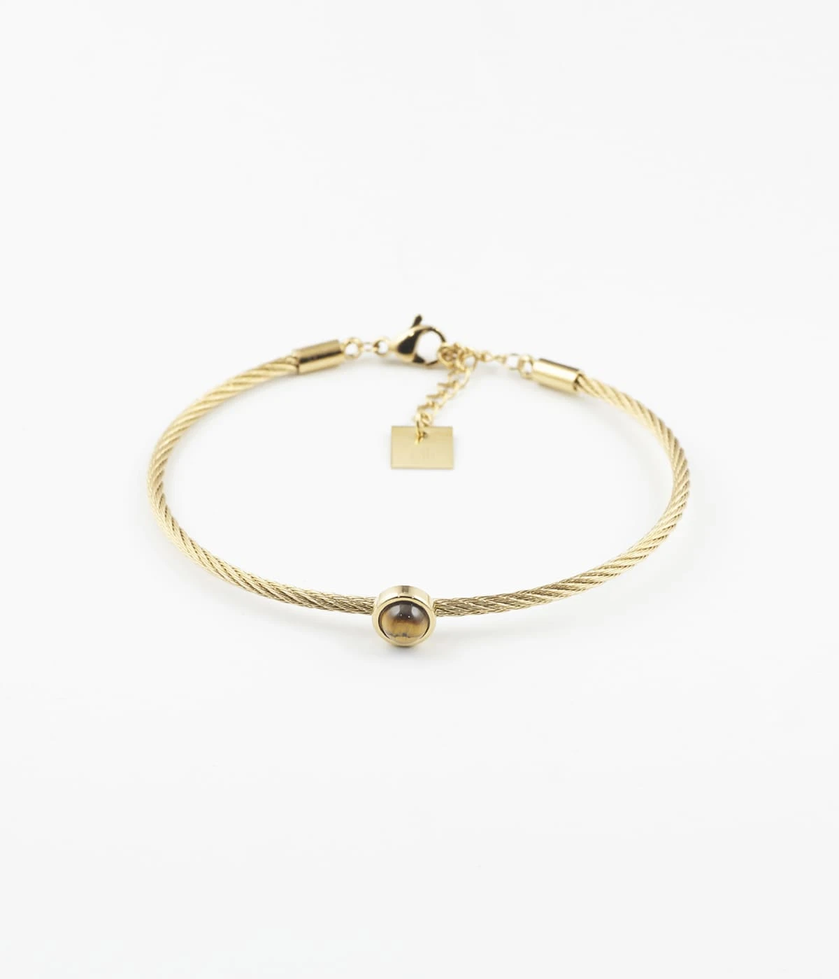 Bracelet jonc en acier doré à l’or fin dont le métal est travaillé comme un câble sur lequel est sertie une pierre fine de couleur en cabochon.