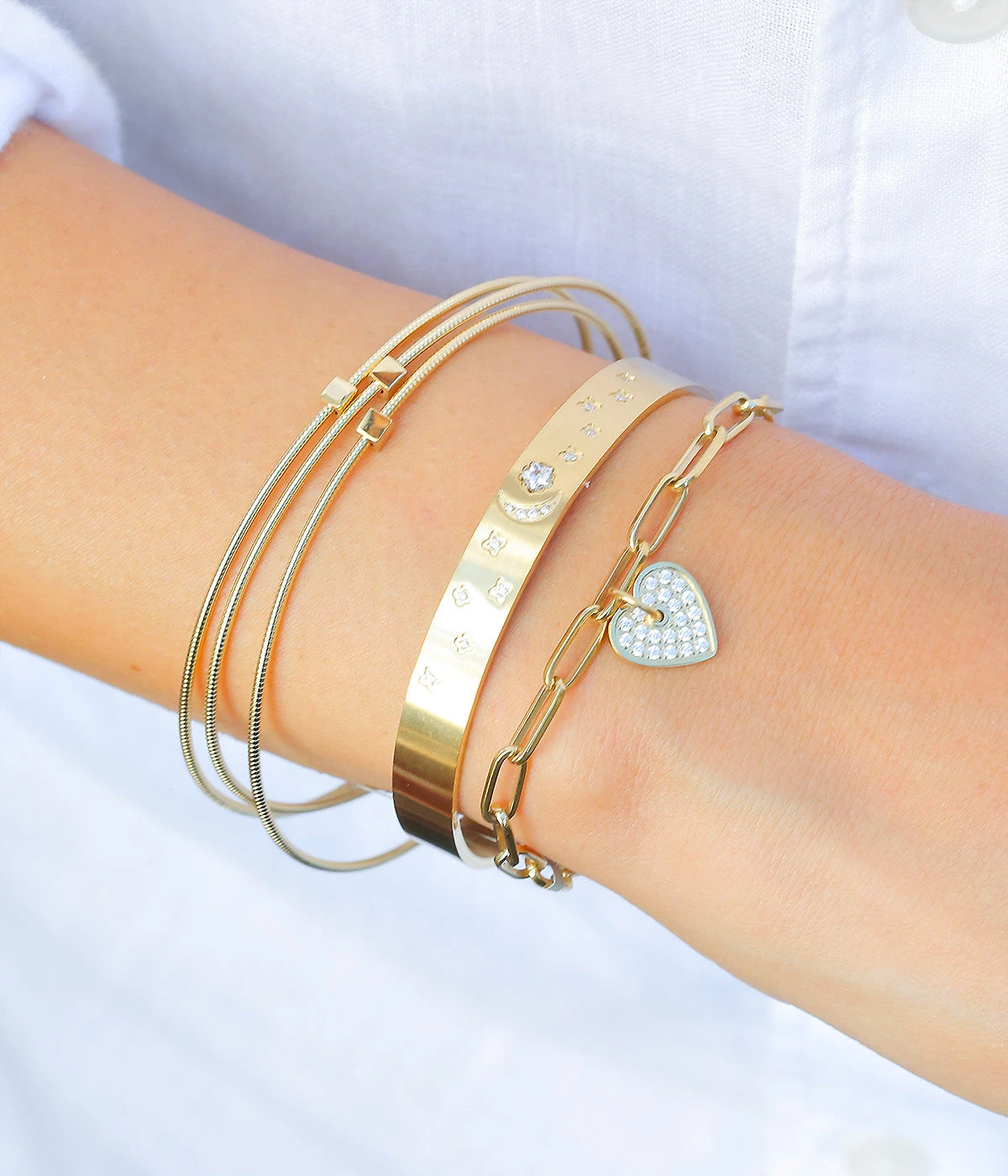 Bracelet jonc ajustable en acier uni ou doré à l’or fin serti de petits zirconiums en forme d’étoiles.