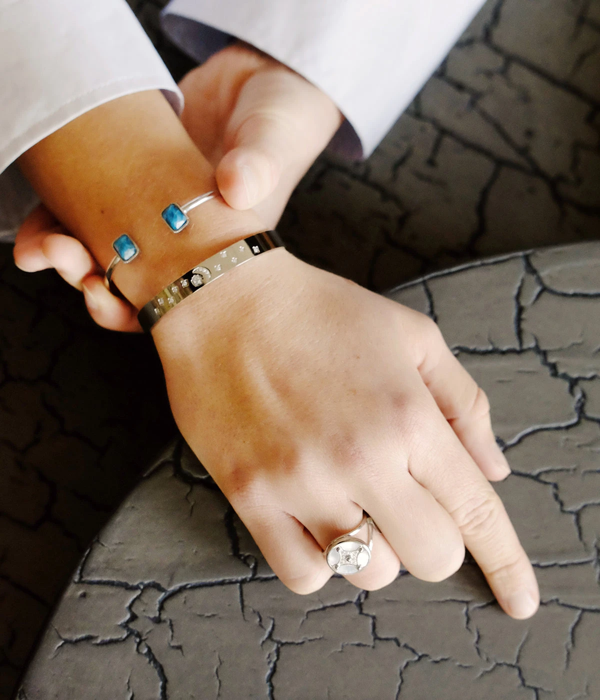 Ce bracelet très moderne se porte comme un bijou de peau dans toutes les occasions et se mélange facilement avec des bracelets à gros maillons pour une allure très “rock”.