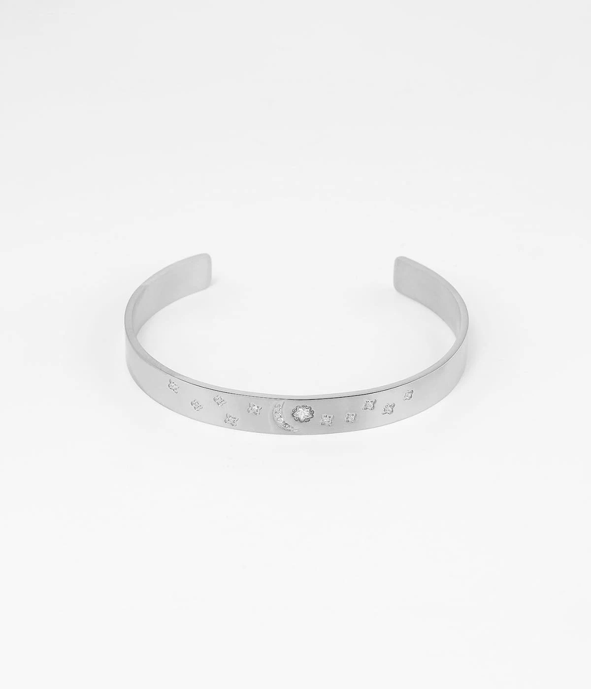 Bracelet jonc ajustable en acier uni ou doré à l’or fin serti de petits zirconiums en forme d’étoiles.