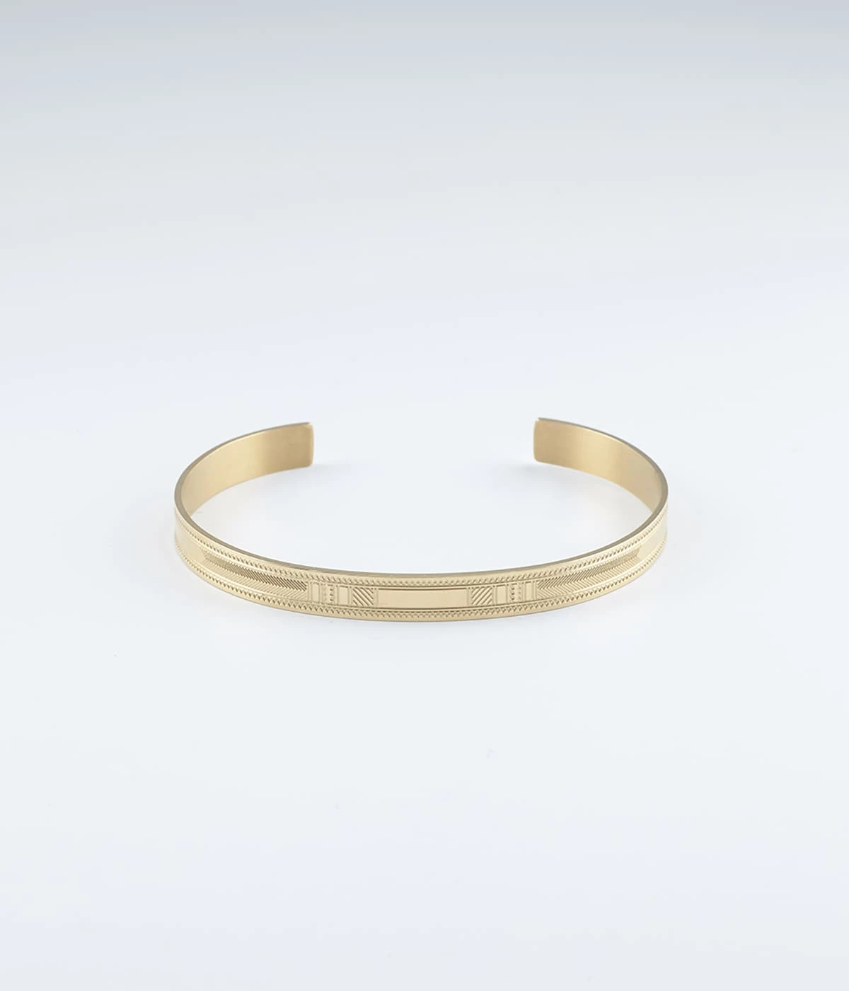 Bracelet jonc en acier uni ou doré à l’or fin. Ce petit bijou est finement gravé à la main avec de motifs graphiques.