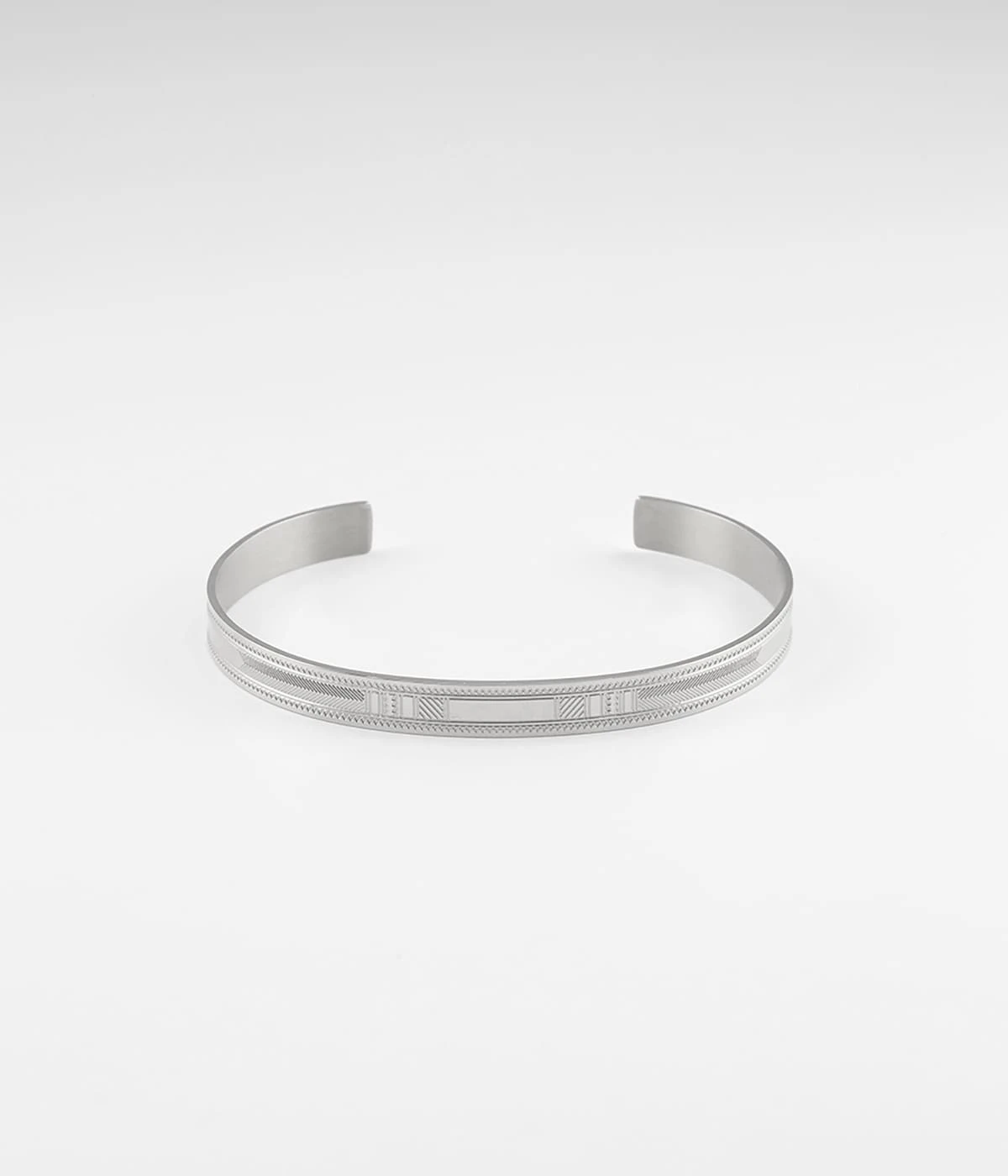 Bracelet jonc en acier uni ou doré à l’or fin. Ce petit bijou est finement gravé à la main avec de motifs graphiques.