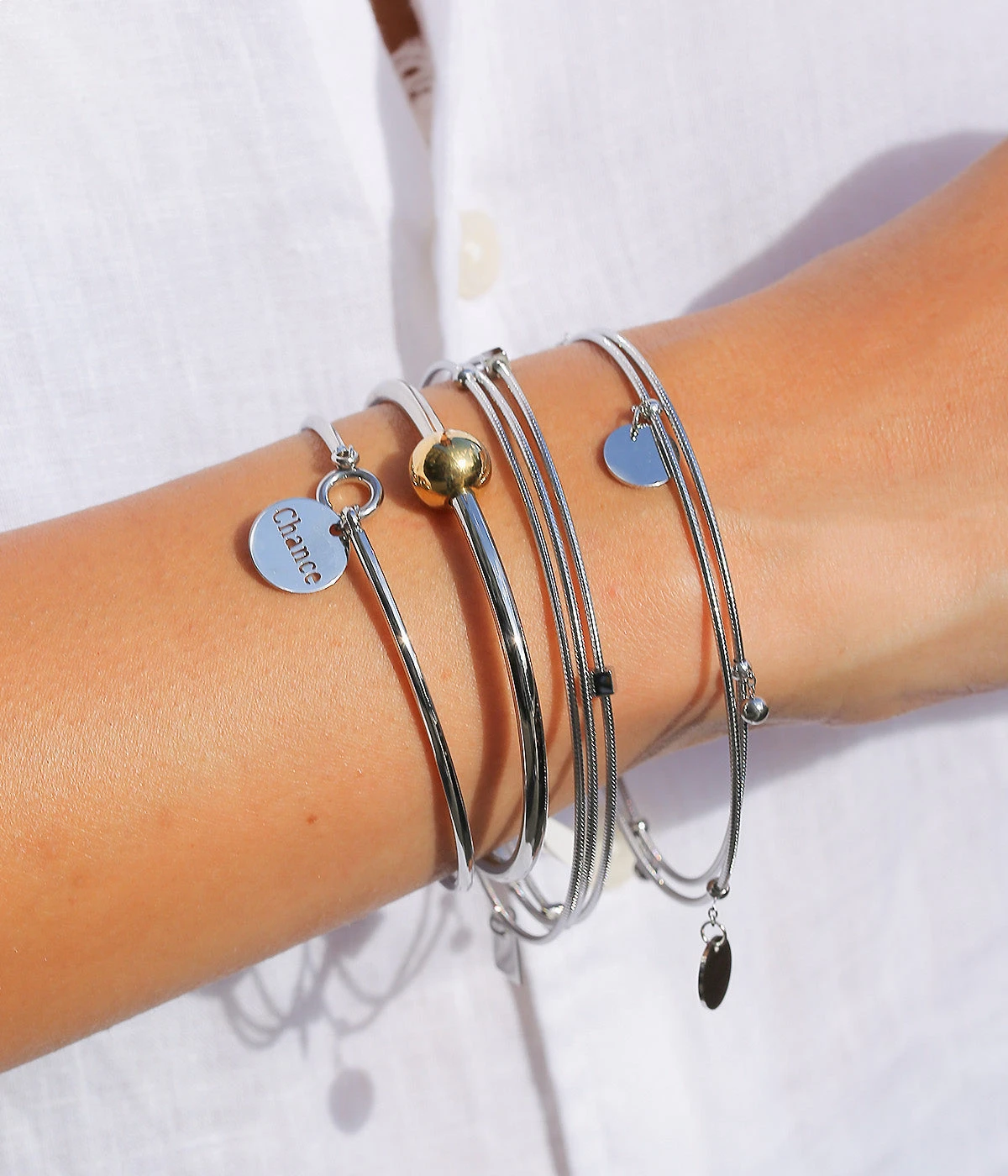 Bracelet jonc en acier uni ou doré à l’or fin sur lequel est attaché une petite médaille gravée du mot “Chance”.