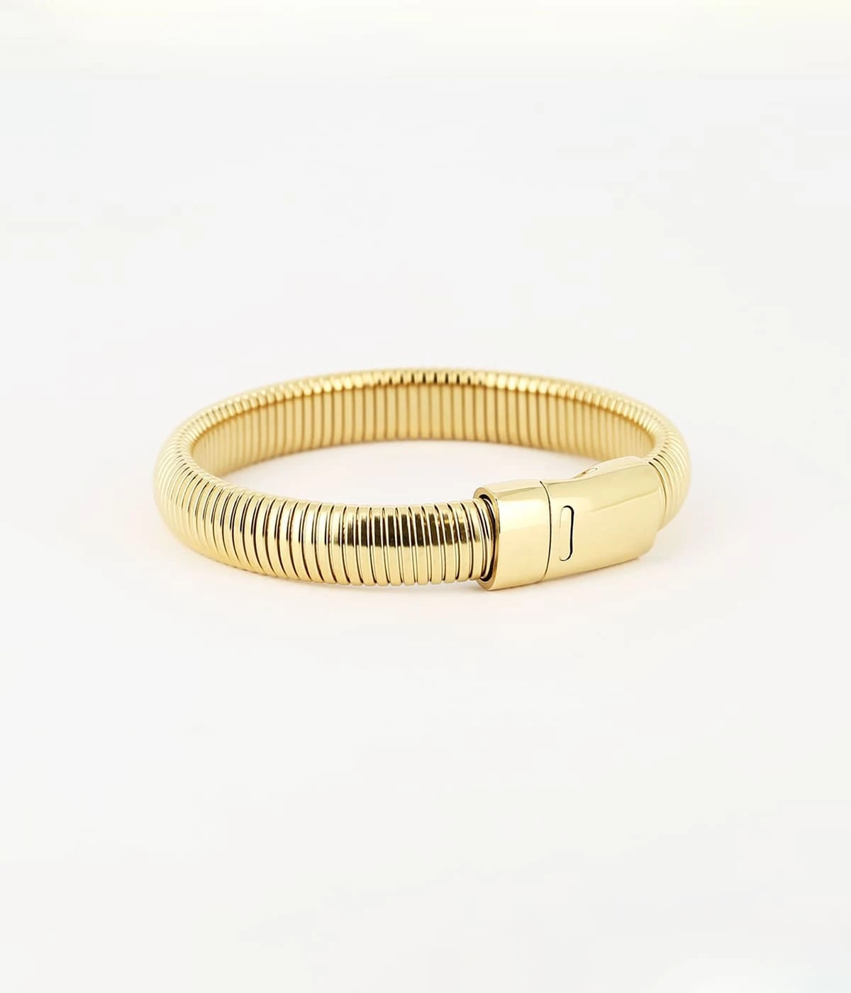 Bracelet jonc aimanté en acier uni ou doré à l’or fin imitant un accordéon.