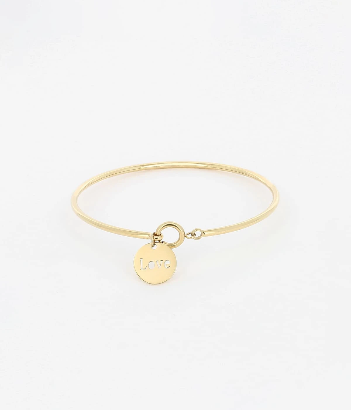 Bracelet jonc en acier uni ou doré à l’or fin sur lequel est attaché une petite médaille gravée du mot “Love”.
