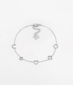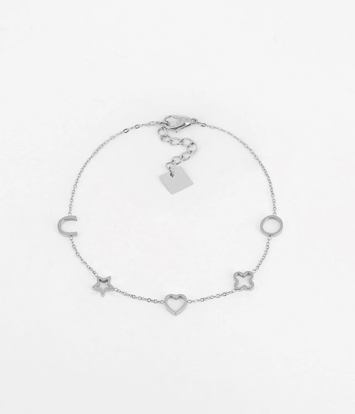 Bracelet en acier doré à l’or fin sur lequel sont attachés des motifs de cercle, fleur, cœur et étoile ajourées très contemporaines.