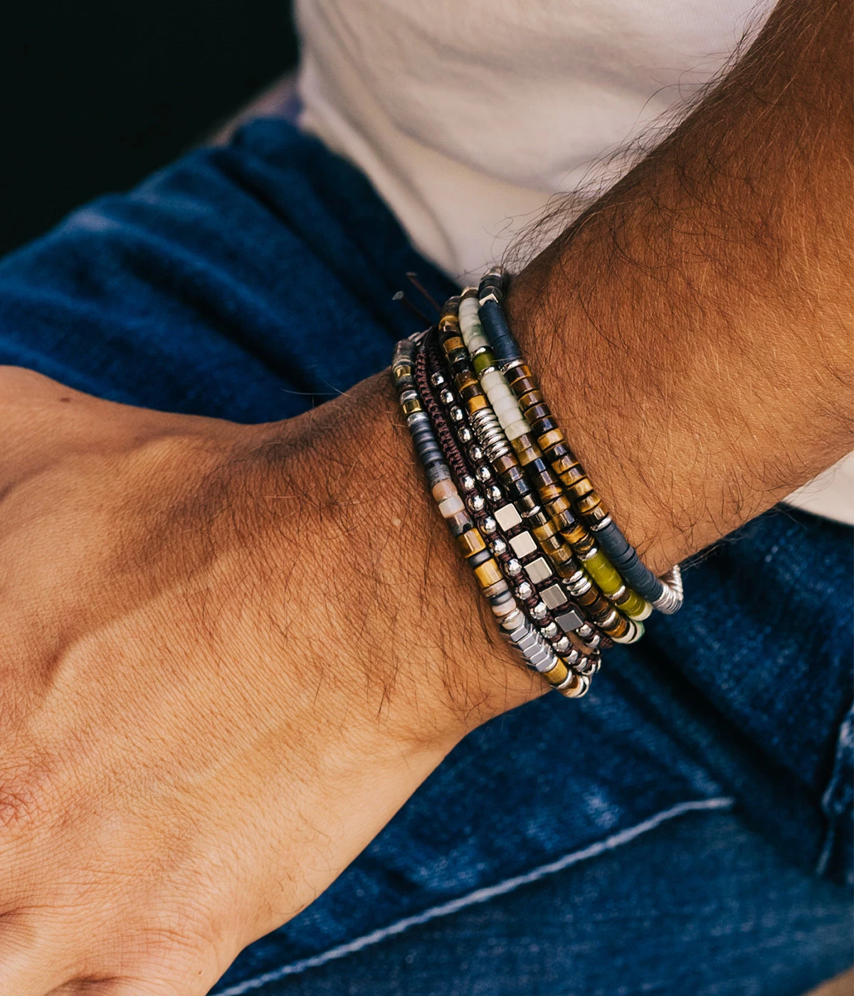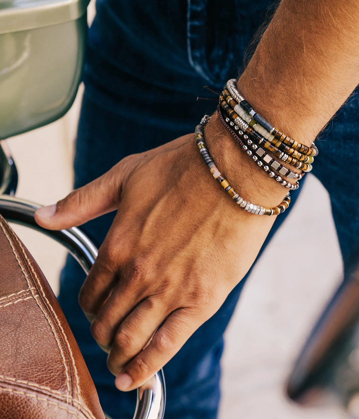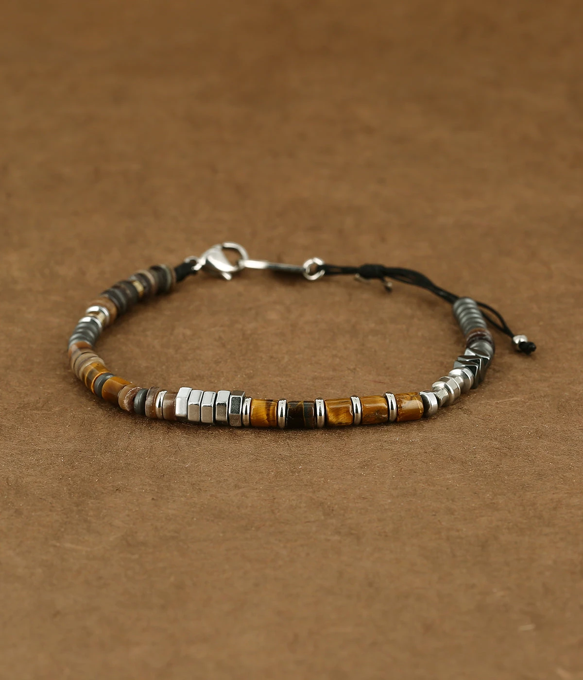 Bracelet cordon ajustable sur lequel sont enfilées des pierres fines d’oeil de tigre et d’acier gris mat.