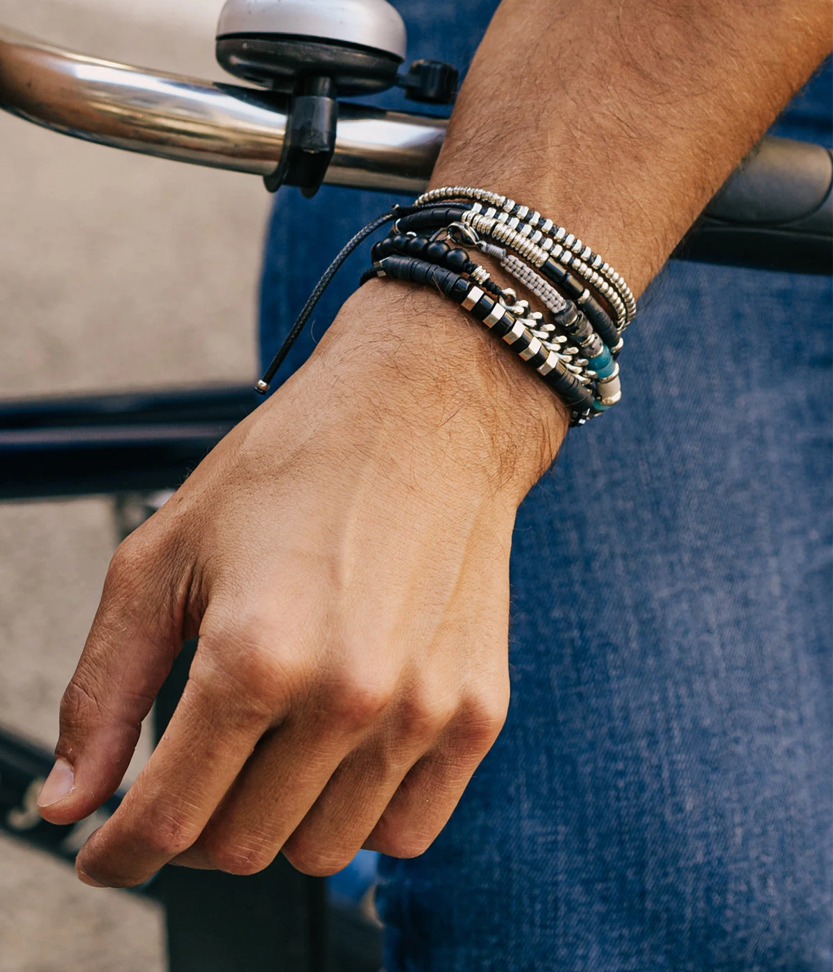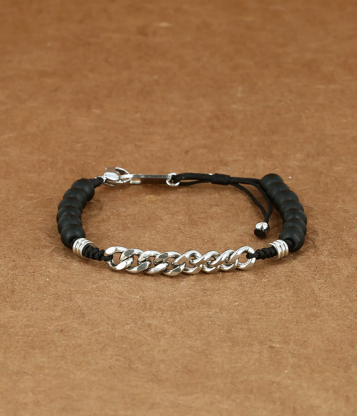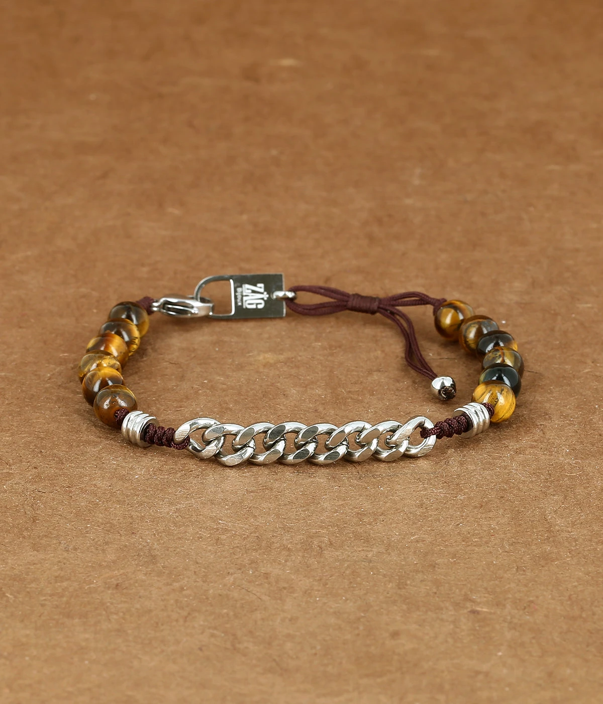 Bracelet ajustable sur lequel sont enfilées des boules de pierres naturelles et sur lequel des maillons sont présentés.