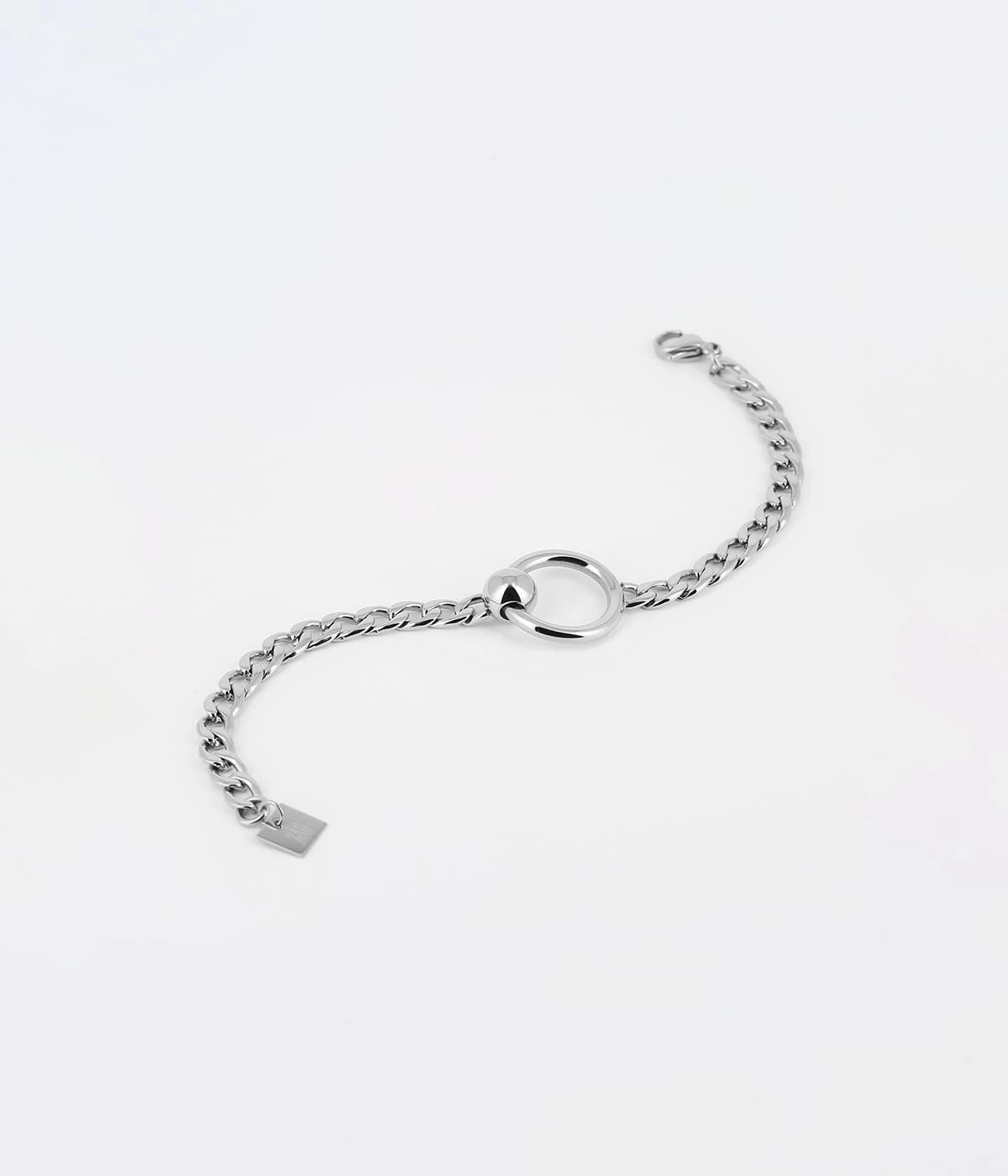 Bracelet à maillons en acier uni ou doré à l’or fin au milieu duquel est placé un anneau de métal.