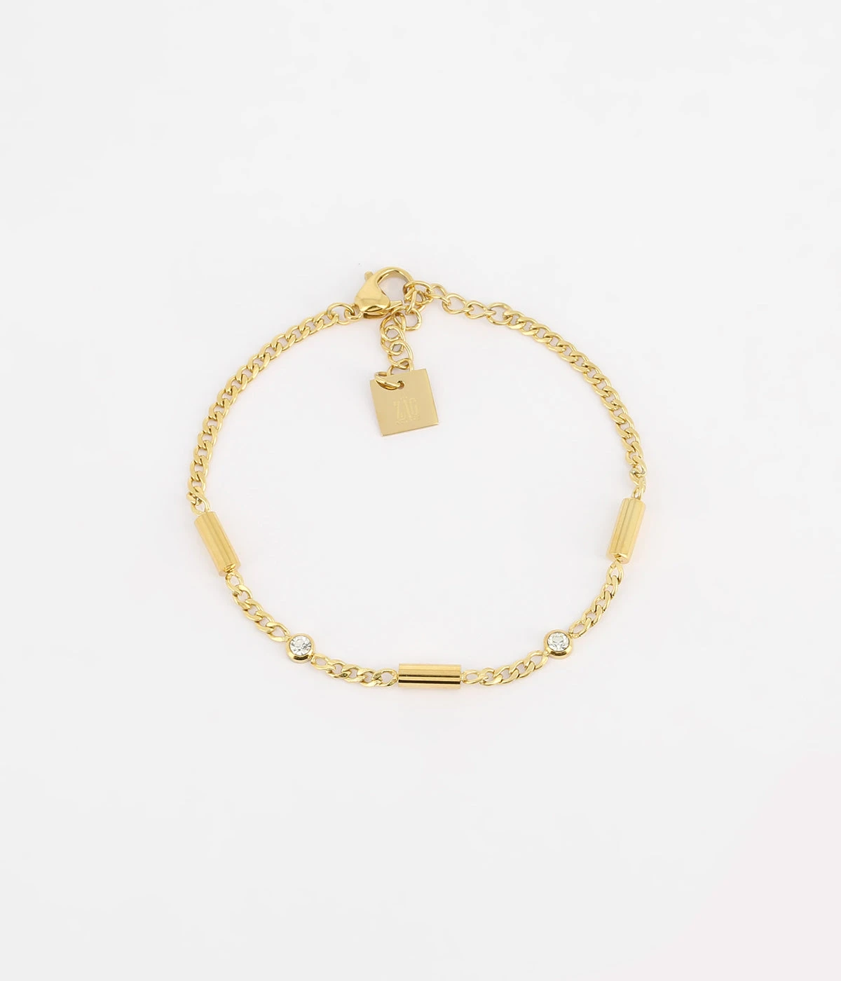 Bracelet gourmette en acier uni ou doré à l’or fin parsemé de cylindre en métal et de zirconiums.