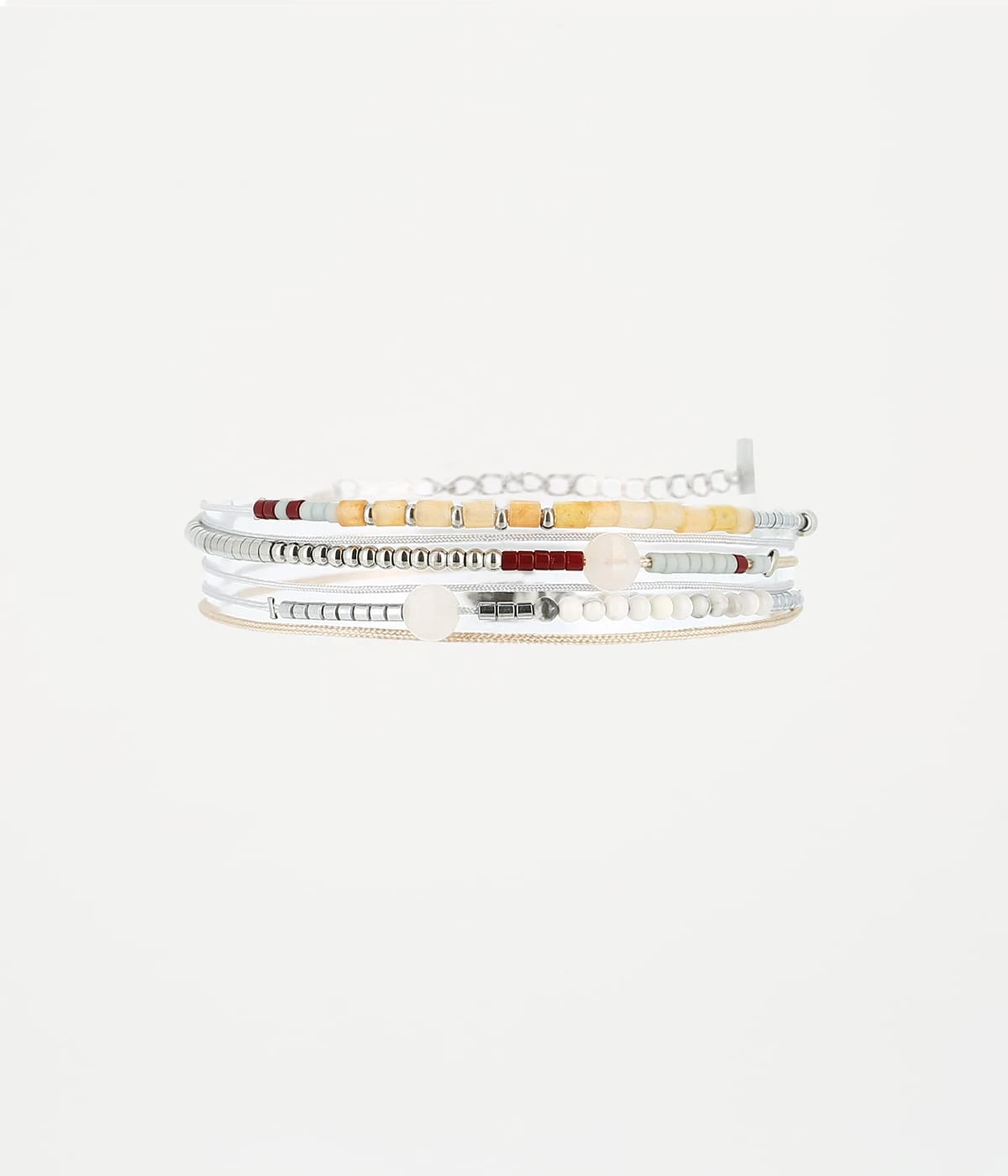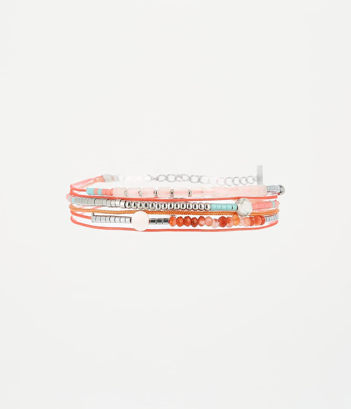 Bracelet multi-rang coloré qui s’enlace deux fois autour du poignet. Sont enfilées des perles de métal et de pierres fines.