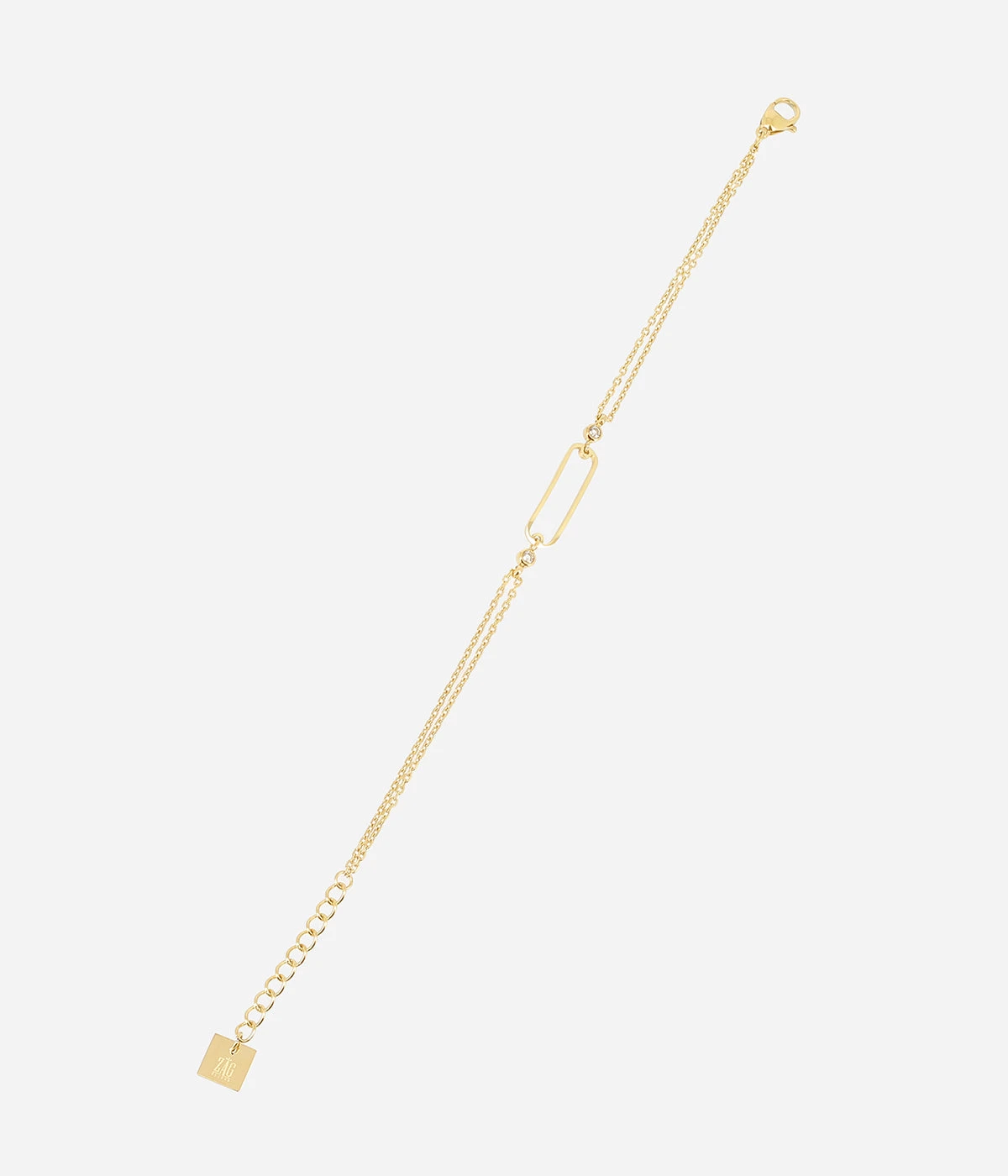 Bracelet en acier doré à l’or fin sur lequel est attaché un motif de forme géométrique. Les zirconiums apportent une petite touche d’éclat à ce bijou.