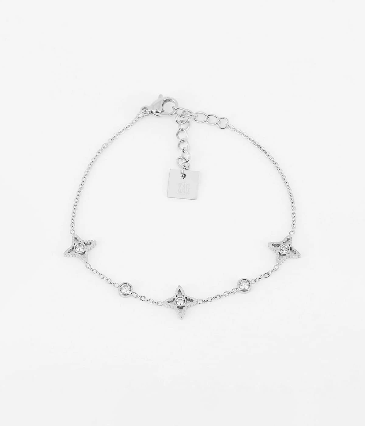 Bracelet chaînette en acier uni ou doré à l’or fin sur lequel sont attachés des motifs gothiques pavés de zirconiums brillants.