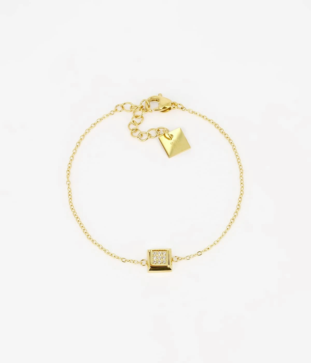 Bracelet en acier doré à l’or fin sur lequel est attaché un médaillon lumineux serti de zirconiums.
