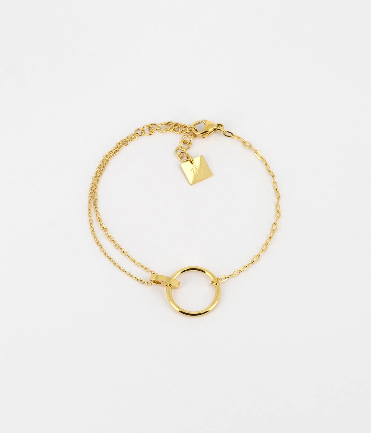 Bracelet en acier uni ou doré à l’or fin sur lequel est suspendu un pendentif en forme de cercle.