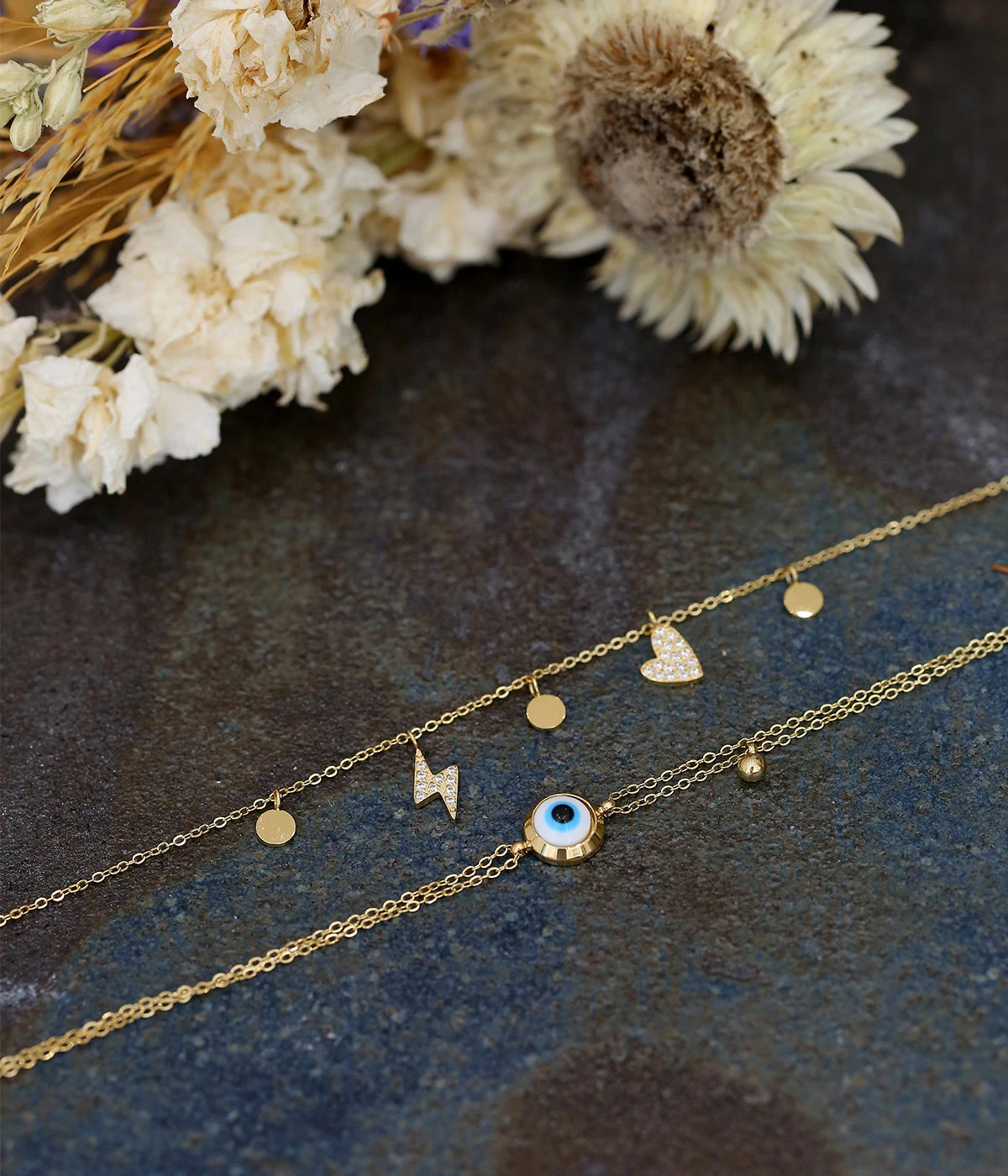 - Décliné en collier, chaîne de cheville et boucles d’oreilles