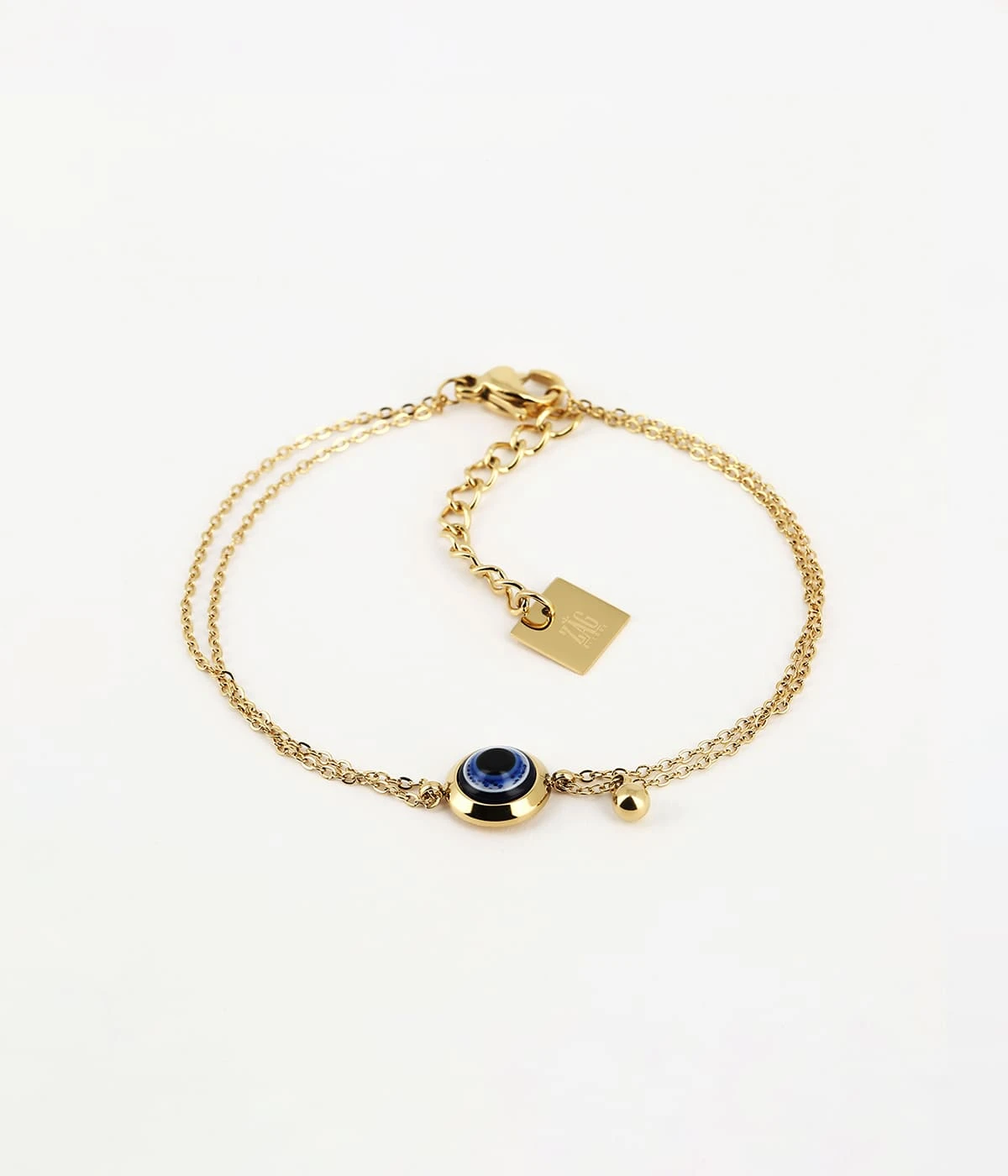 Bracelet double chaîne en acier uni ou doré à l’or fin sur lequel un motif de petit œil coloré et serti de métal est attaché.