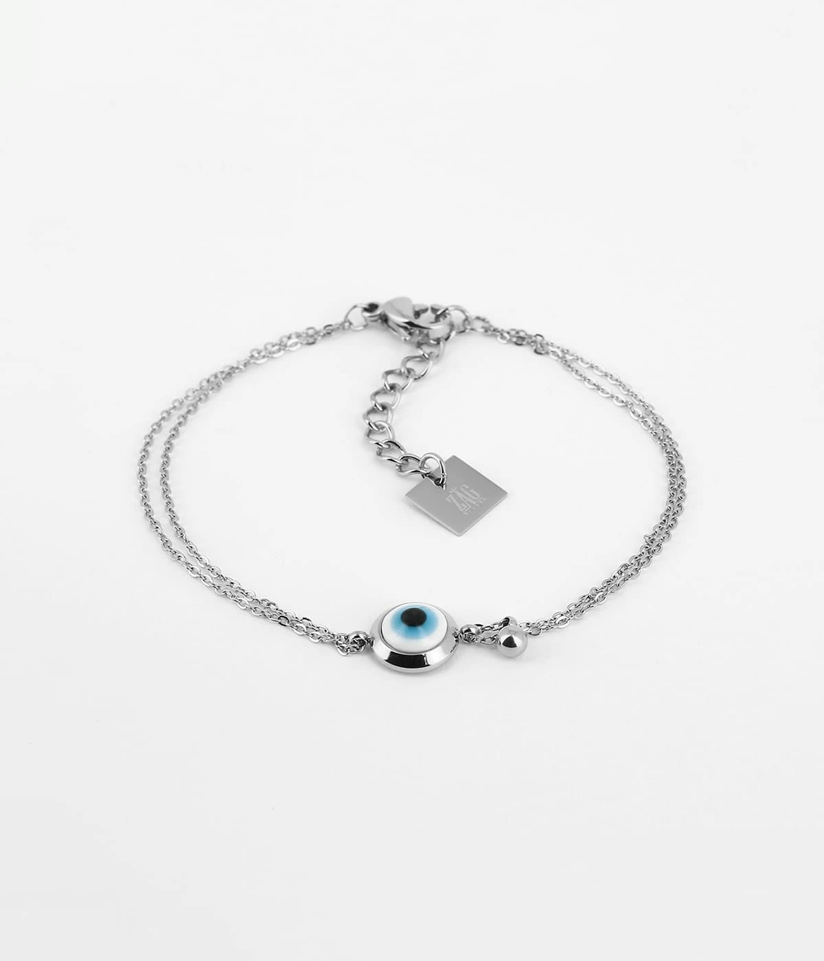 Bracelet double chaîne en acier uni ou doré à l’or fin sur lequel un motif de petit œil coloré et serti de métal est attaché.