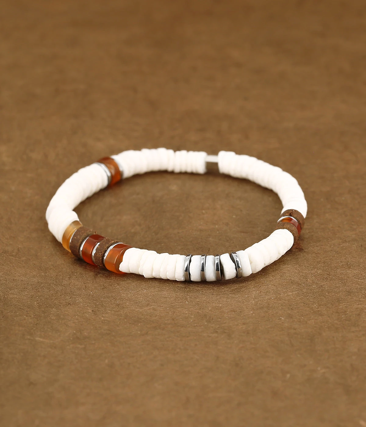Bracelet élastique sur lequel sont enfilées des pierres fines de couleurs parsemées de motifs en métal. Dans l’esprit surfeur, ce bracelet masculin est très lumineux sur le bras.