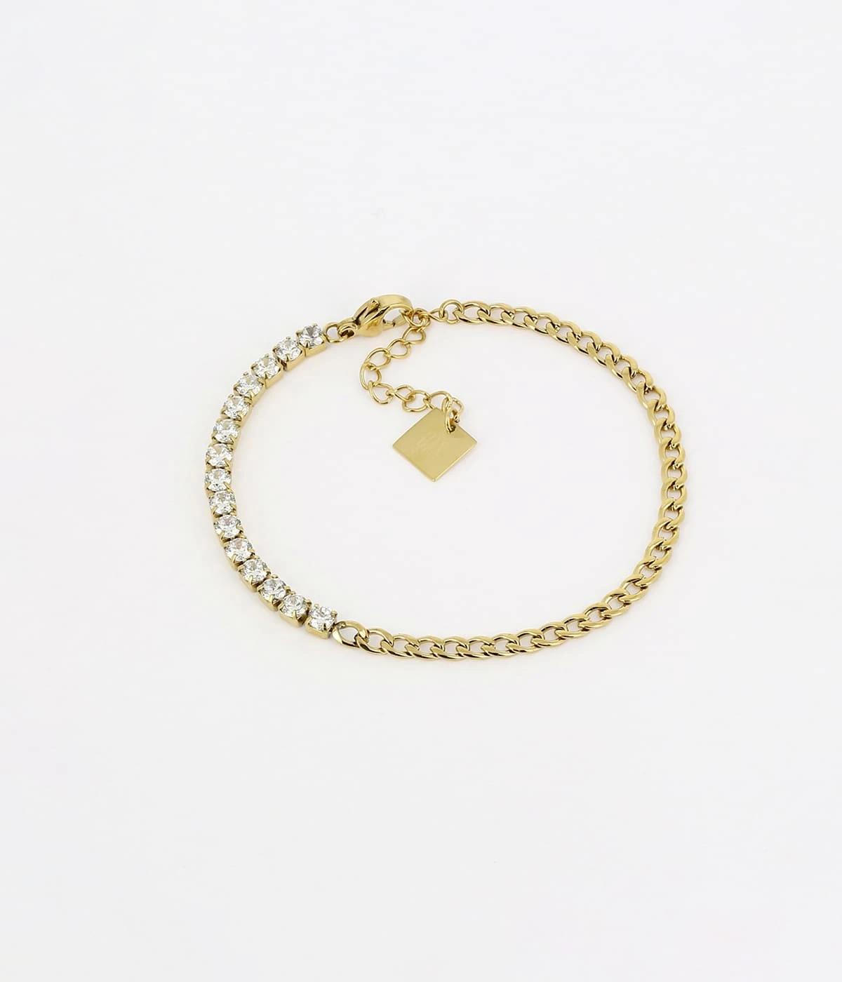Bracelet chaîne en acier uni u doré à l’or fin sur lequel des zirconiums se succèdent avec un sertissage carré.
