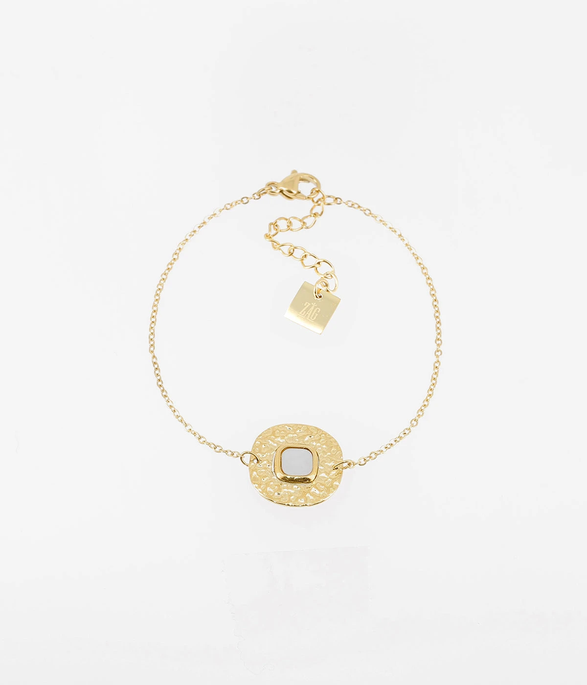 Bracelet chaînette en acier doré à l’or fin au centre duquel se trouve une petite médaille sertie d’une pierre semi-précieuse.