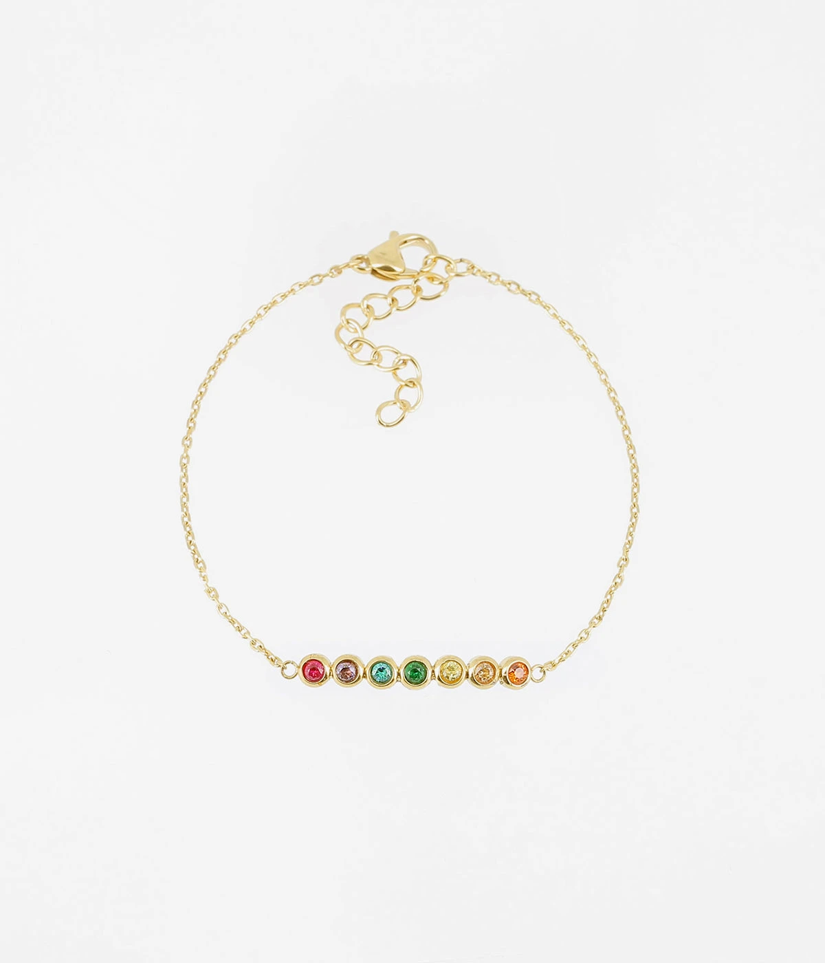 Bracelet en acier doré à l’or fin sur lequel se trouve les couleurs des 7 chakras : racine, sacré, plexus solaire, coeur, gorge, 3ème oeil et couronne.
