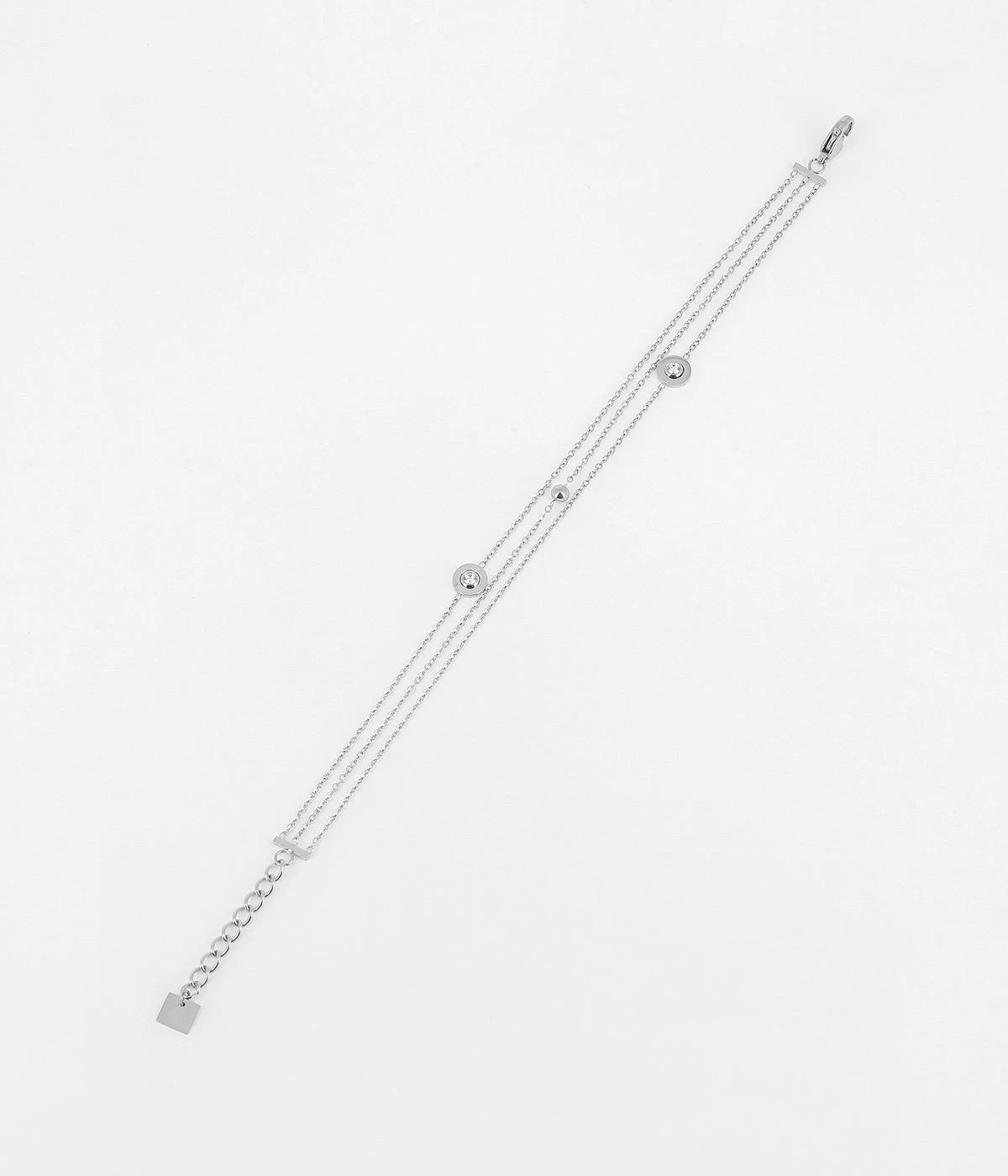 Bracelet en acier uni ou doré à l’or fin à triple rang. Deux petites pastilles serties d’un zirconium coloré y sont attachés.