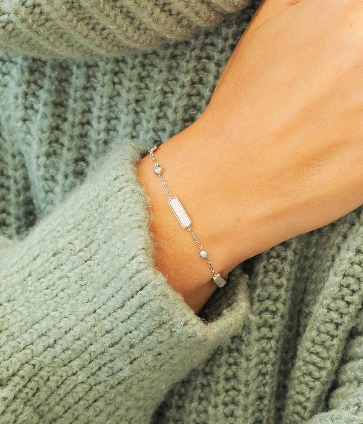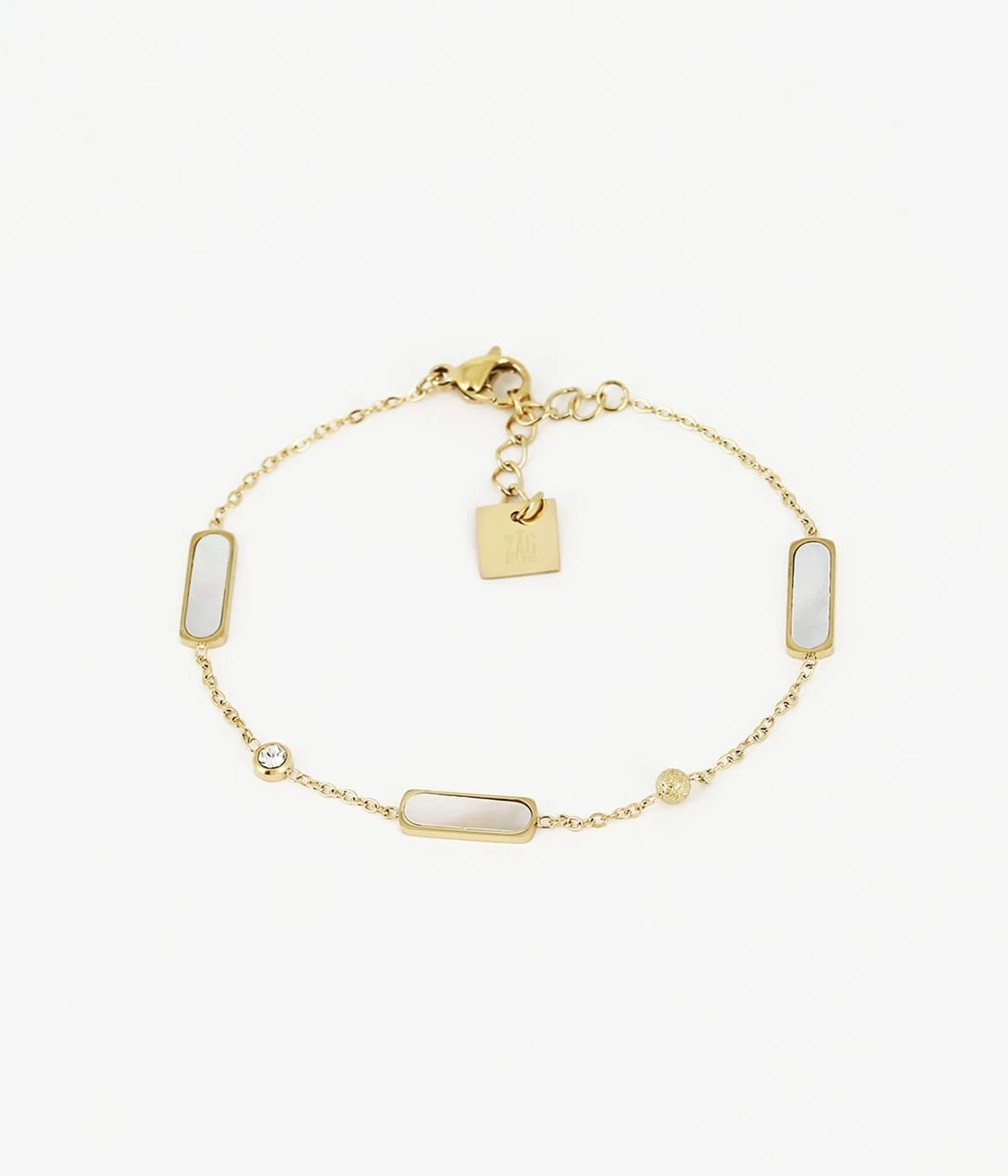 Ce bracelet en acier uni ou doré à l’or fin, dépeint un subtil mélange de zirconiums et de nacre blanche.